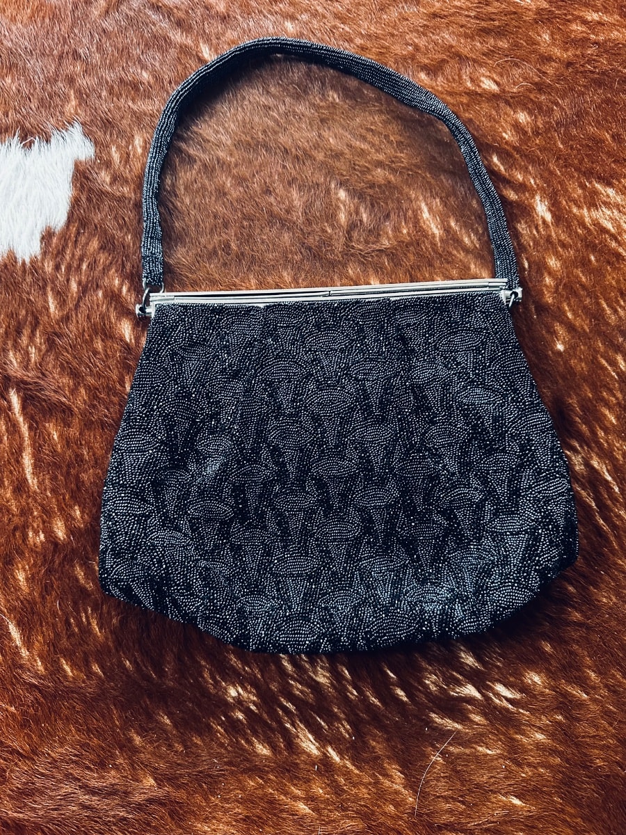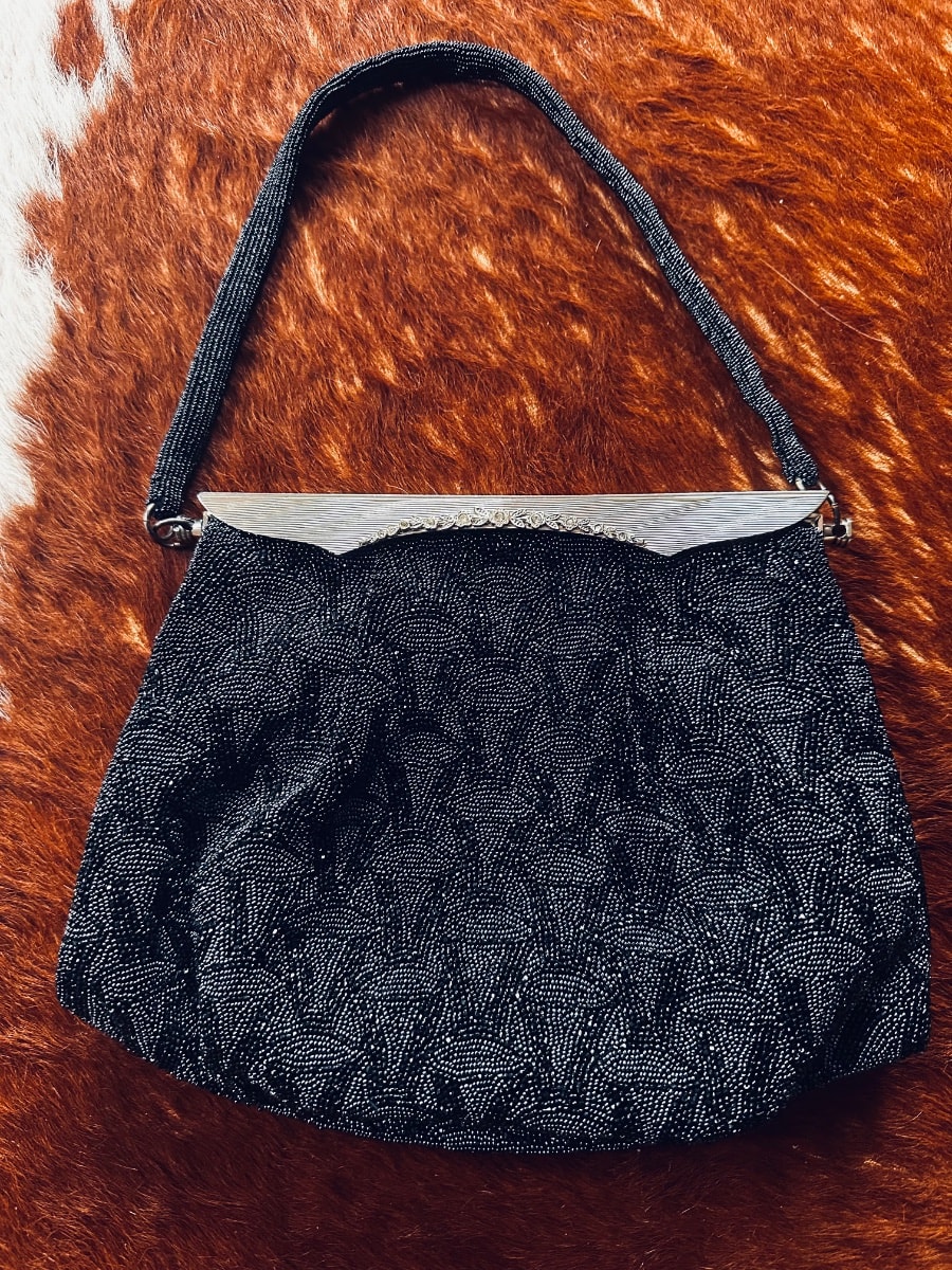 This is a quintessential mid-century French beaded evening bag, featuring intricate black micro-beading in a classic fan motif.