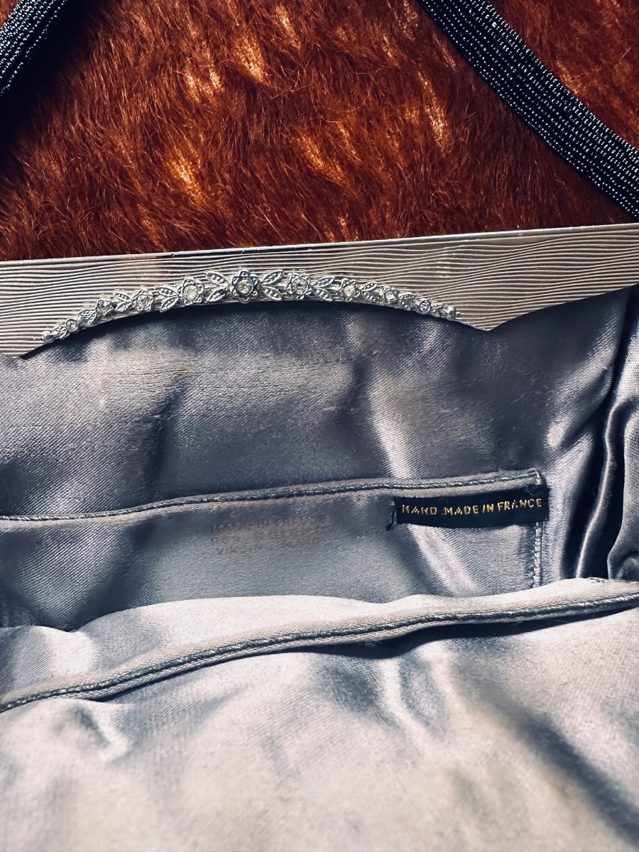 The exterior beadwork appears remarkably intact with no obvious 'runs' or missing patches. The interior satin shows some light staining and fading to the gold-stamped retailer mark, which is common for its age. The metal frame and rhinestones appear bright and secure.