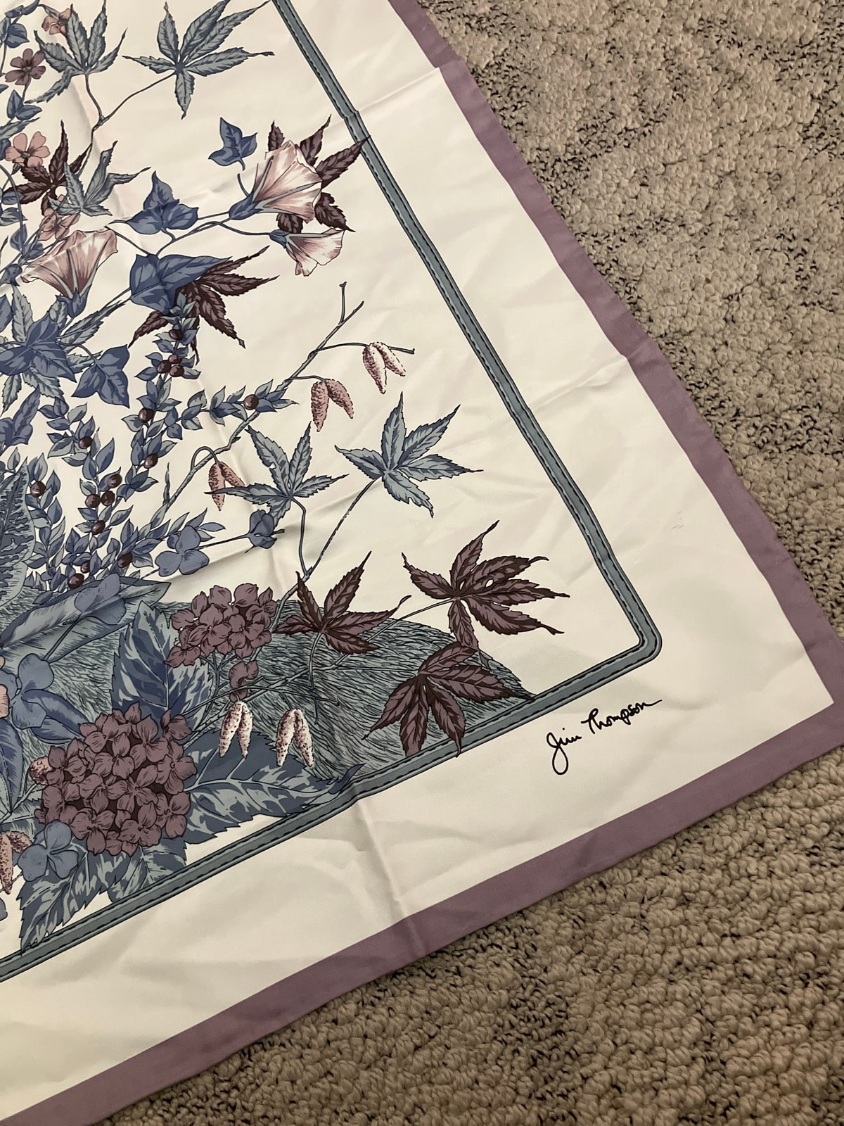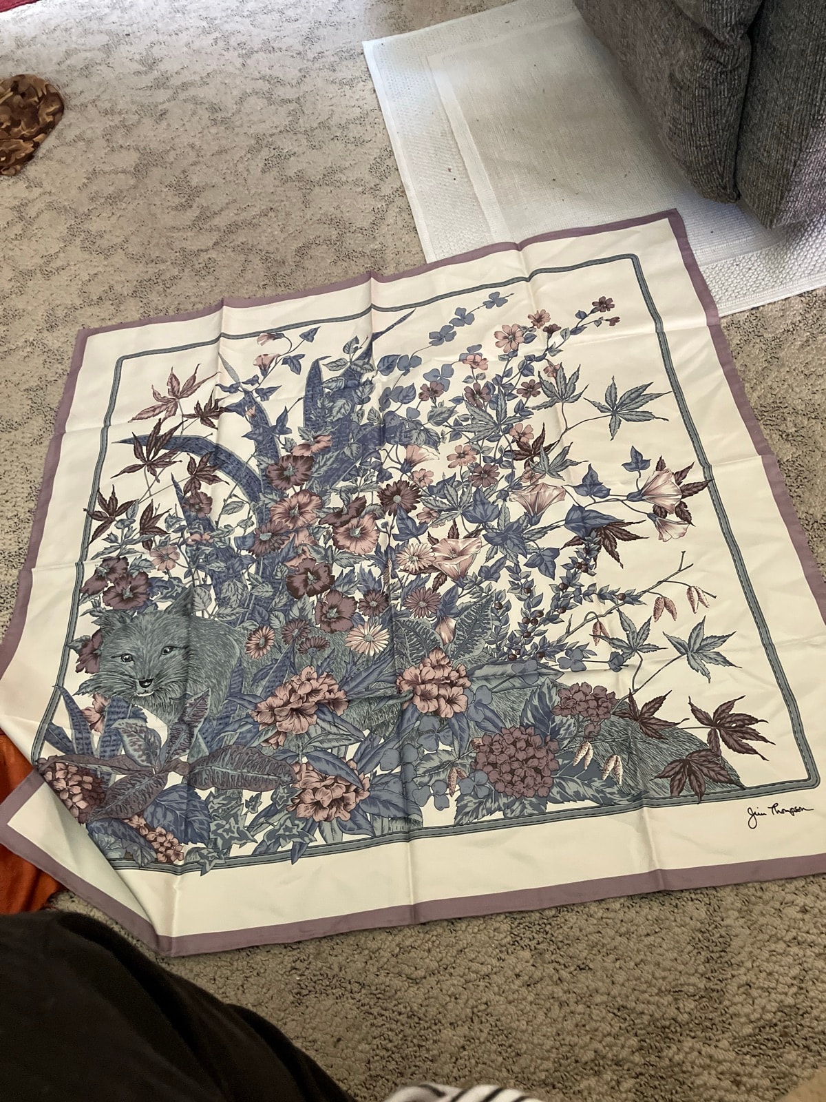 A luxurious hand-finished Thai silk scarf featuring a hidden wildcat peering through a dense thicket of botanical illustrations. The piece showcases the signature muted palette and intricate screen-printing that defined the Jim Thompson brand's mid-to-late century aesthetic.