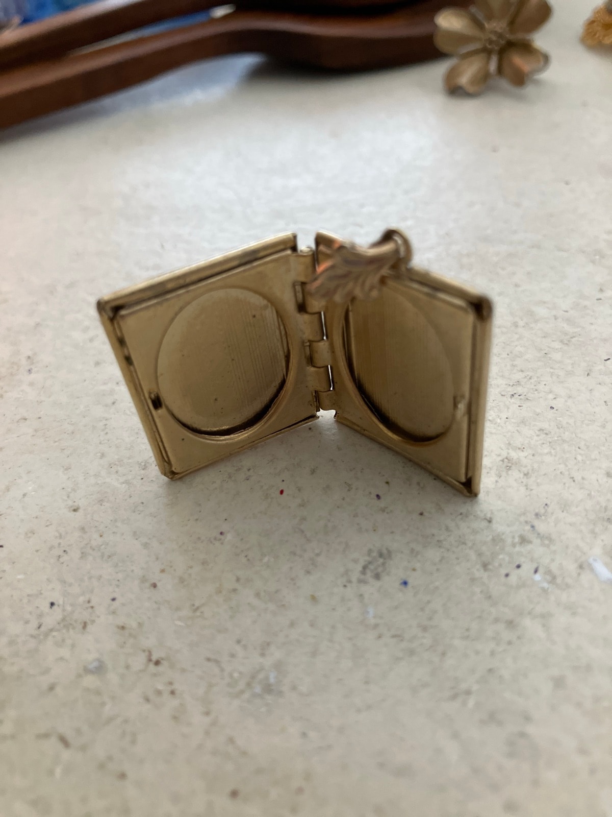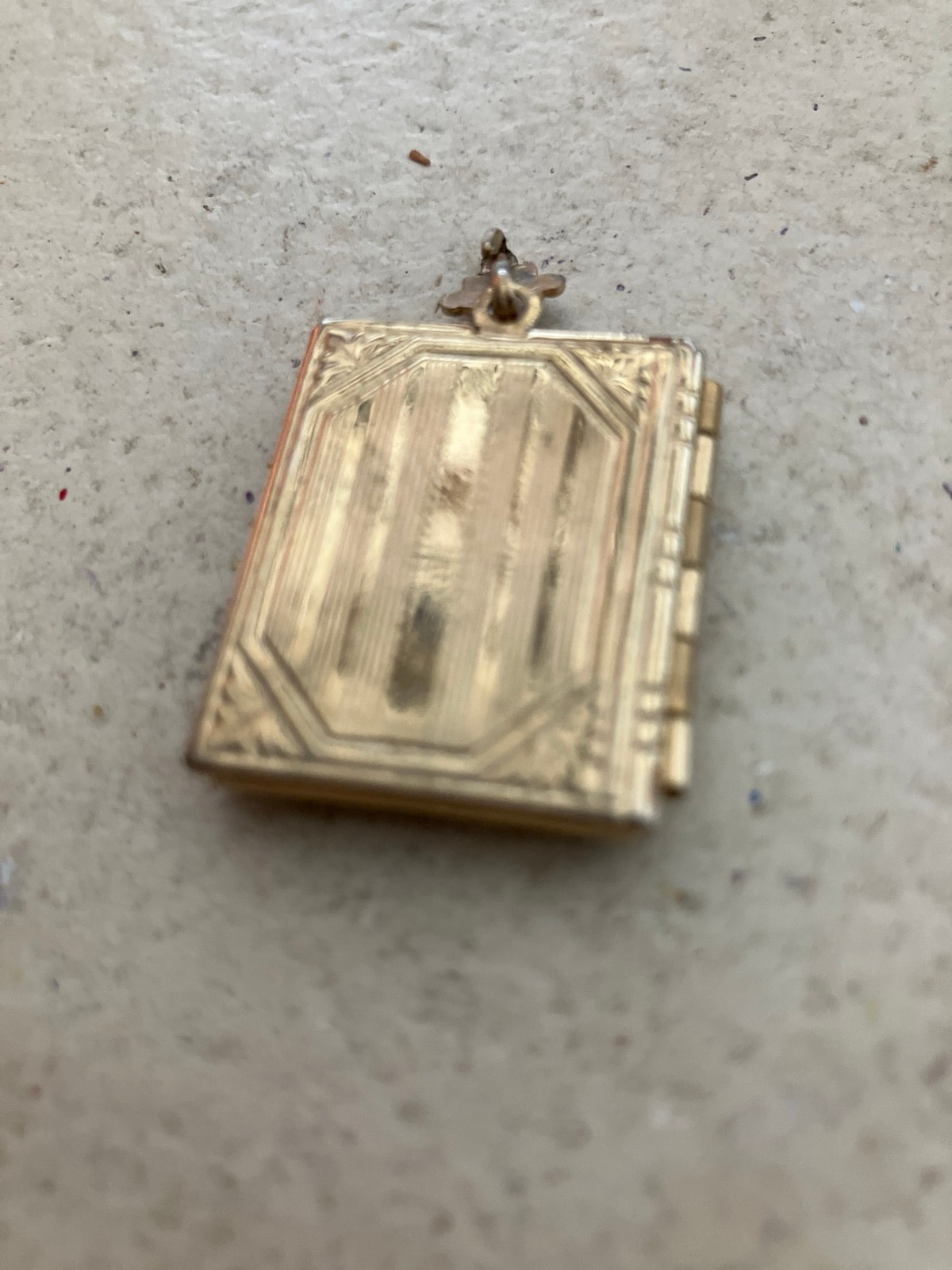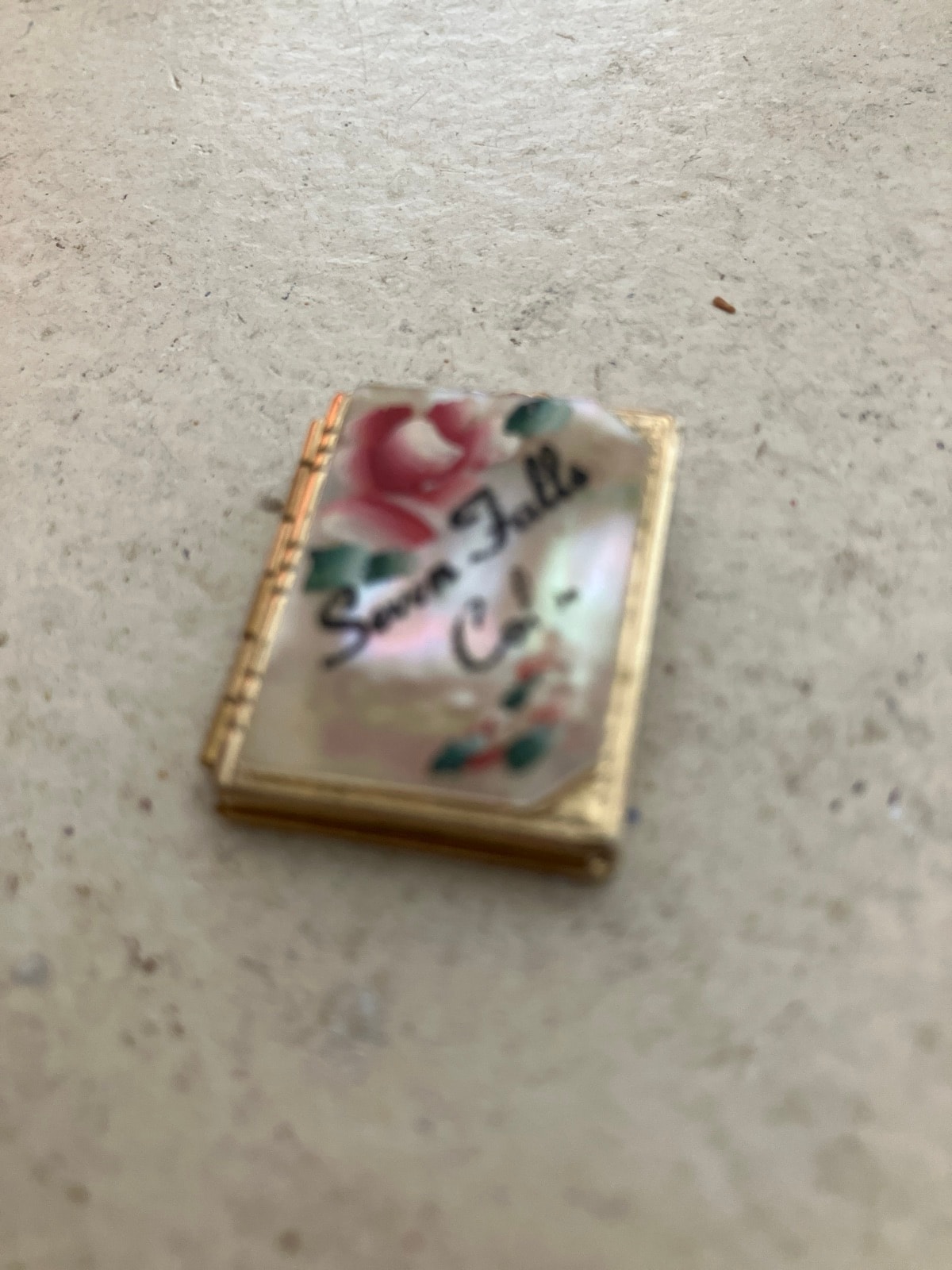 A charming gold-tone book-form locket featuring a hand-painted mother-of-pearl cover. The front is inscribed 'Seven Falls, Co.' alongside a delicate pink rose, opening to reveal two oval photo compartments.