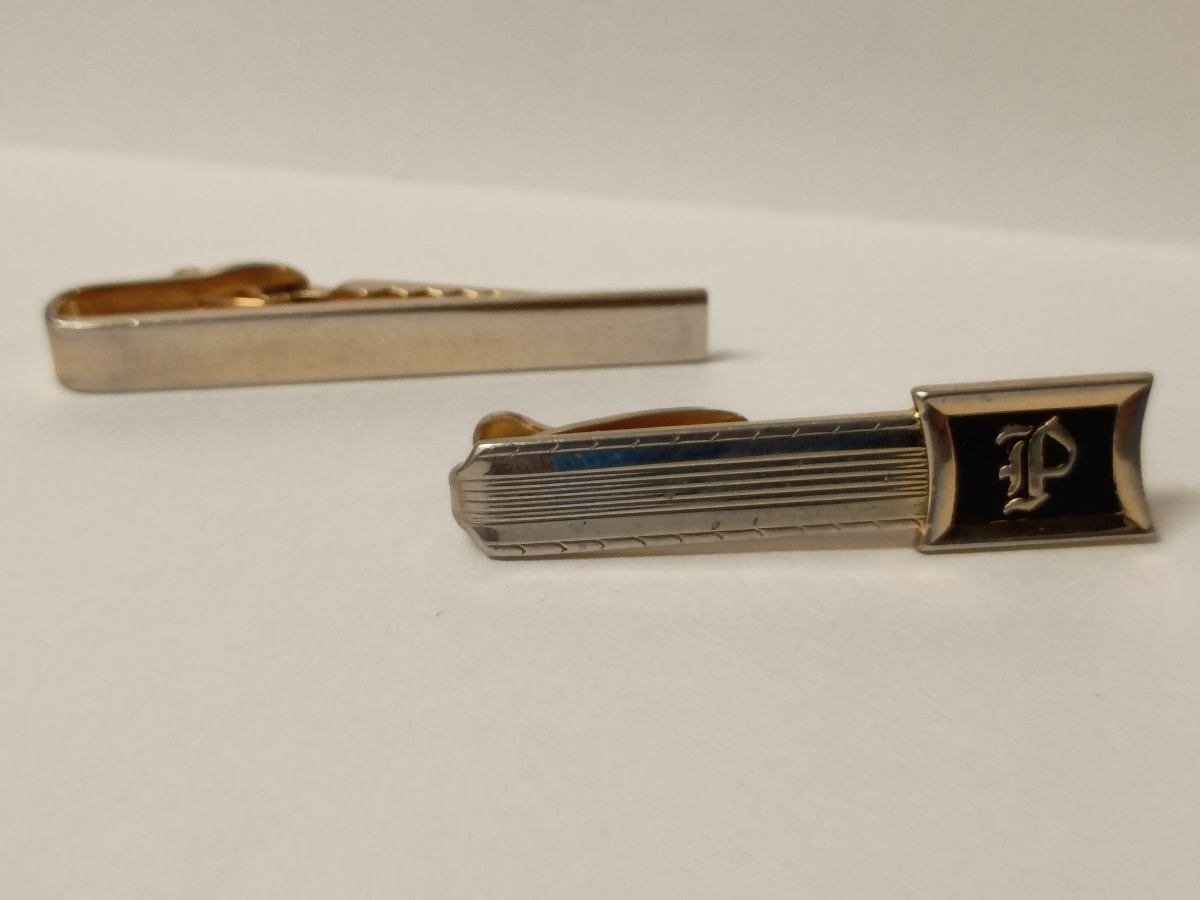 This pair of vintage men's accessories includes a classic minimalist gold-tone bar and a more decorative 'engine-turned' clip featuring a Gothic 'P' monogram on a black enamel plaque. Both pieces feature the sturdy 'alligator' spring-clasp mechanism that became a signature of the Hickok brand.