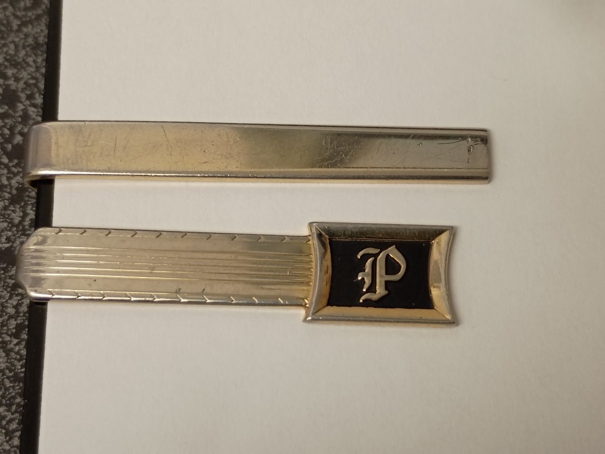 The plain bar shows significant surface scratching and 'flea bites' consistent with frequent use. The monogrammed clip appears to be in better condition with the enamel intact, though light tarnishing is visible on the gold-tone finish. Regular wear reduces value by about 20% compared to 'New Old Stock' examples.
