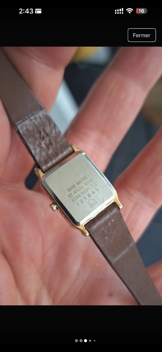The case shows visible wear to the gold plating on the edges and corners, revealing the base metal beneath. The dial and crystal appear well-preserved, though the strap is a modern replacement. Plating wear on vintage dress watches typically reduces the value by roughly 20-30%.