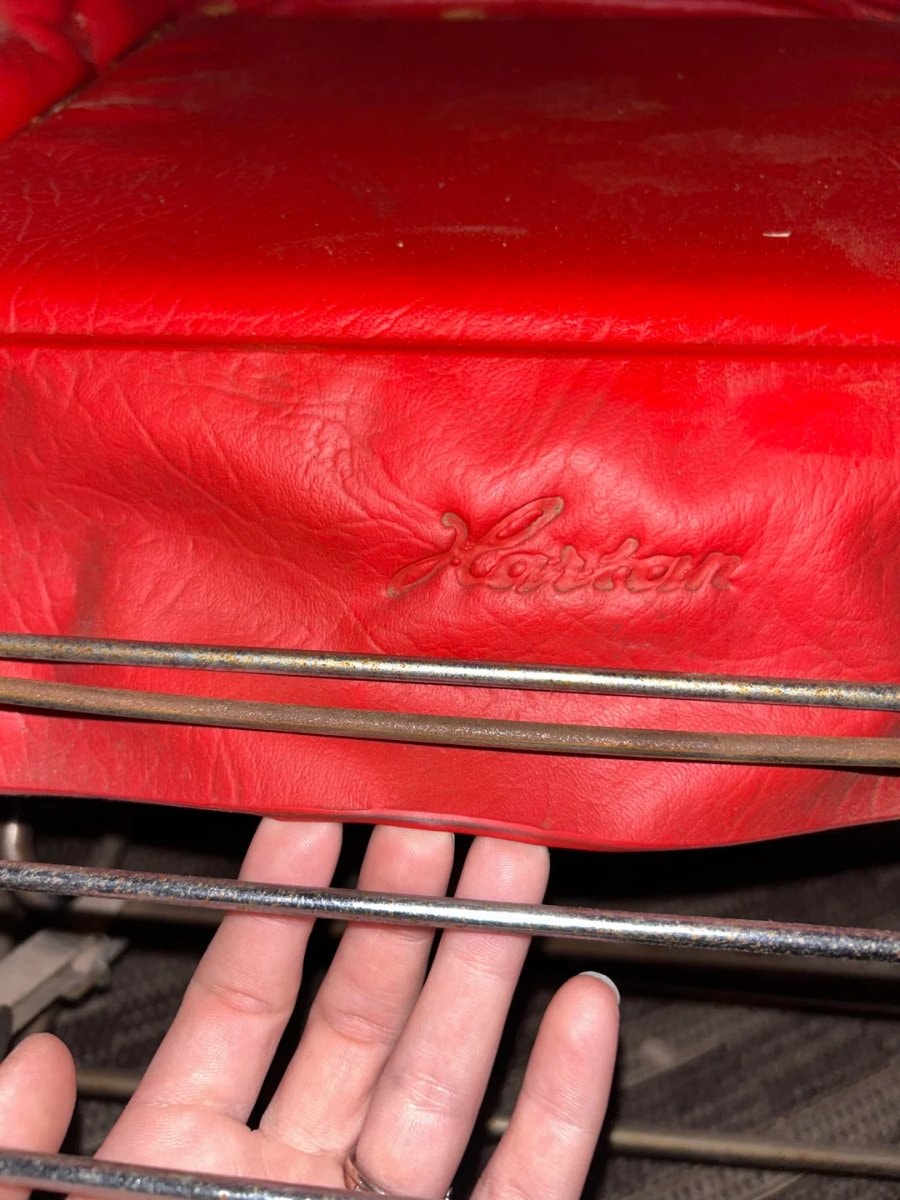 Well-preserved chrome and uncracked vinyl are paramount for this category, as extensive reupholstery or re-chroming costs routinely exceed the item's inherent collectible value. The vinyl shows some surface wear and minor cracking consistent with age, and the chrome frame has visible pitting.