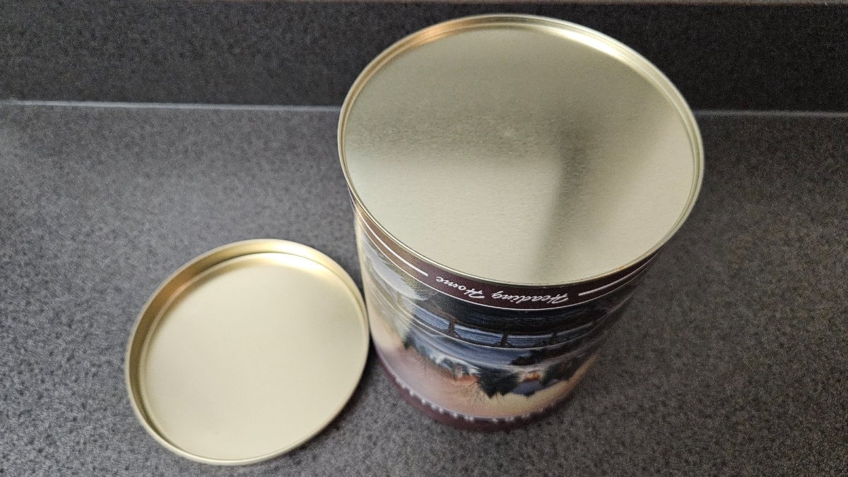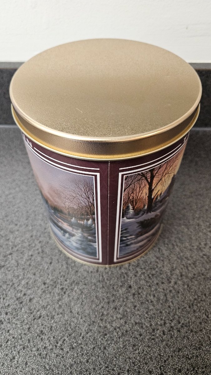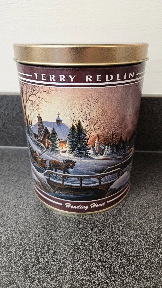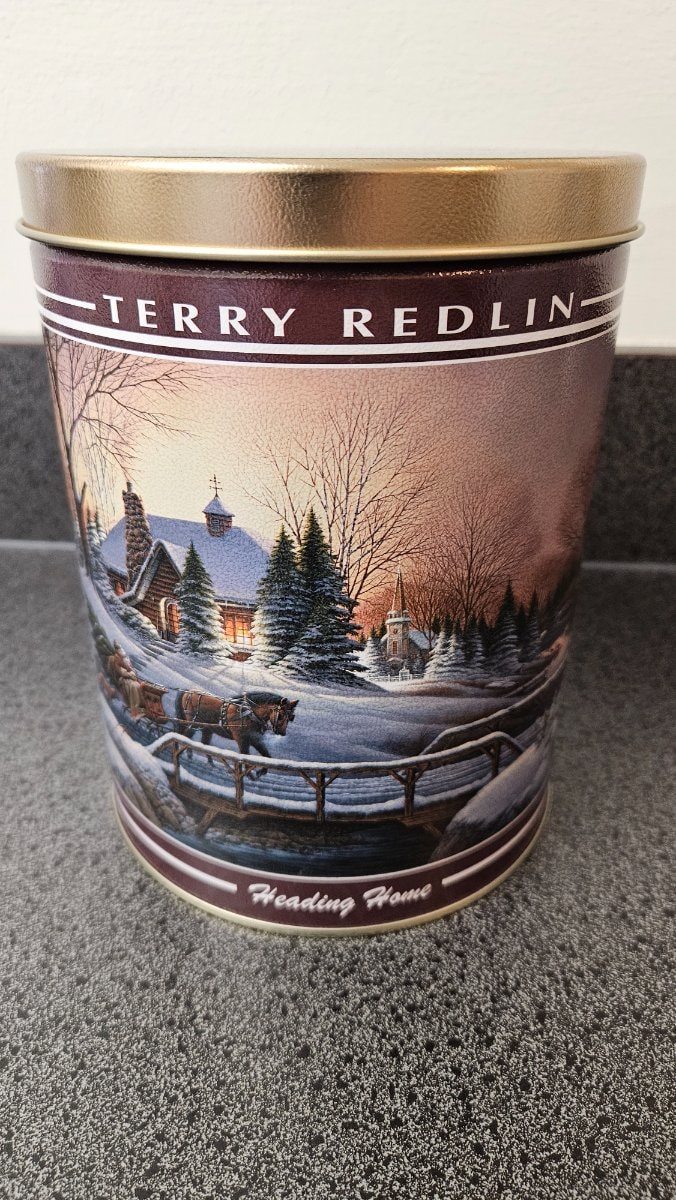 A classic cylindrical lithographed metal tin featuring the 'Heading Home' winter landscape by renowned Americana artist Terry Redlin. Originally used as gift packaging for holiday treats like popcorn or nuts, it has since become a staple of nostalgic seasonal decor.