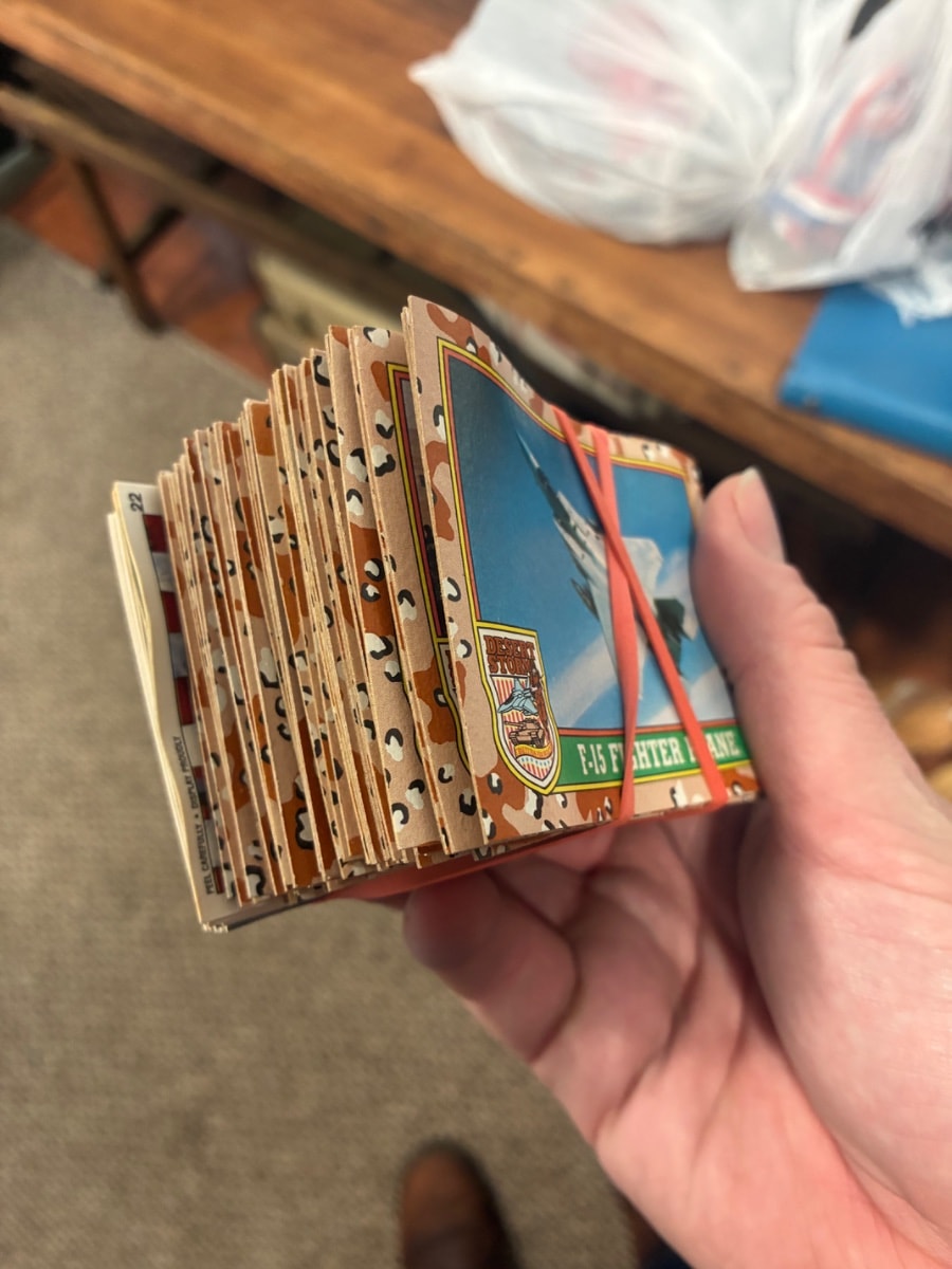 A stack of vintage non-sports trading cards featuring military hardware and personnel from the Persian Gulf War. These cards were produced in real-time as the conflict unfolded, serving as a modern-day equivalent to the war-time bubblegum cards of the 1940s.