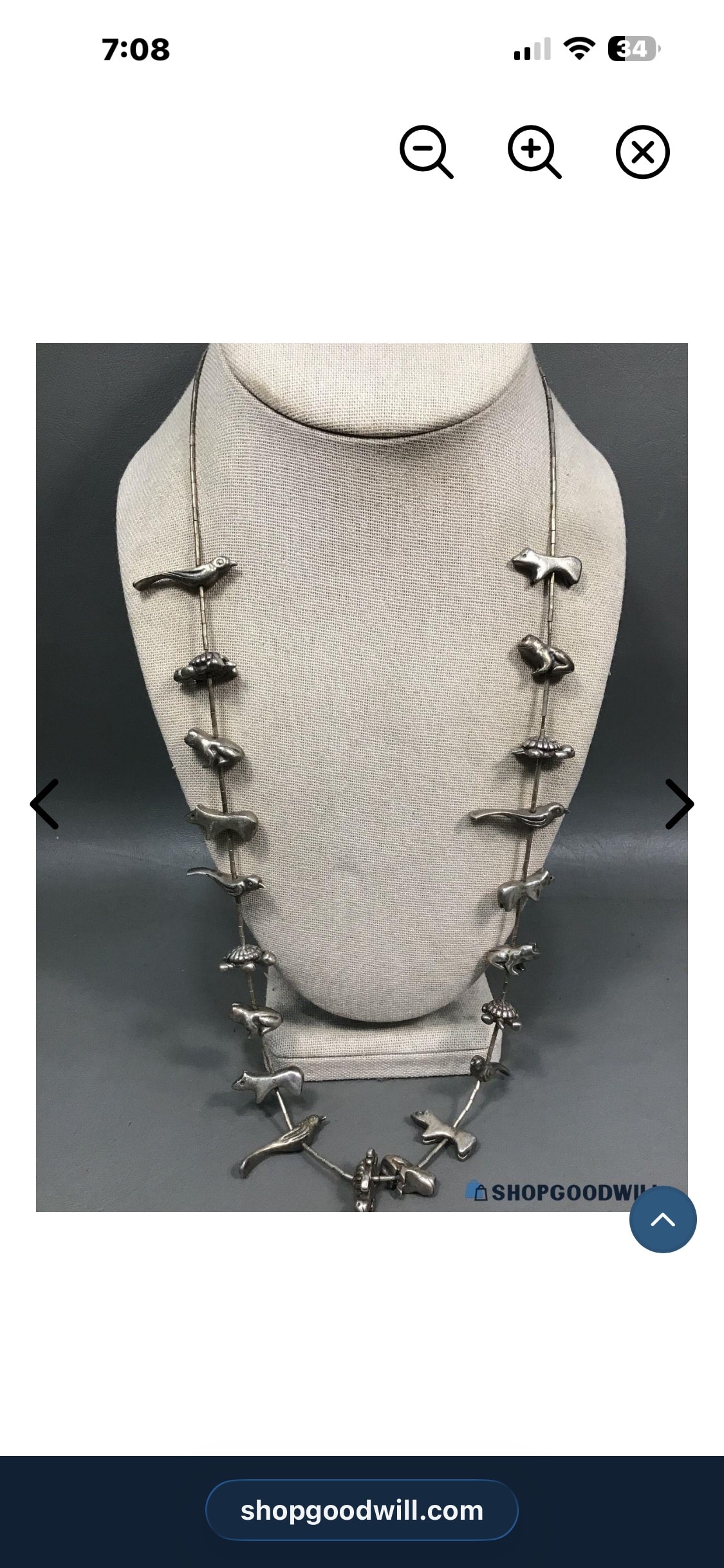 A classic single-strand 'liquid silver' necklace featuring cast sterling silver animal fetishes including bears, birds, frogs, and turtles. These necklaces are prized for their fluid, silk-like movement and the symbolic protection offered by the animal spirits they represent.