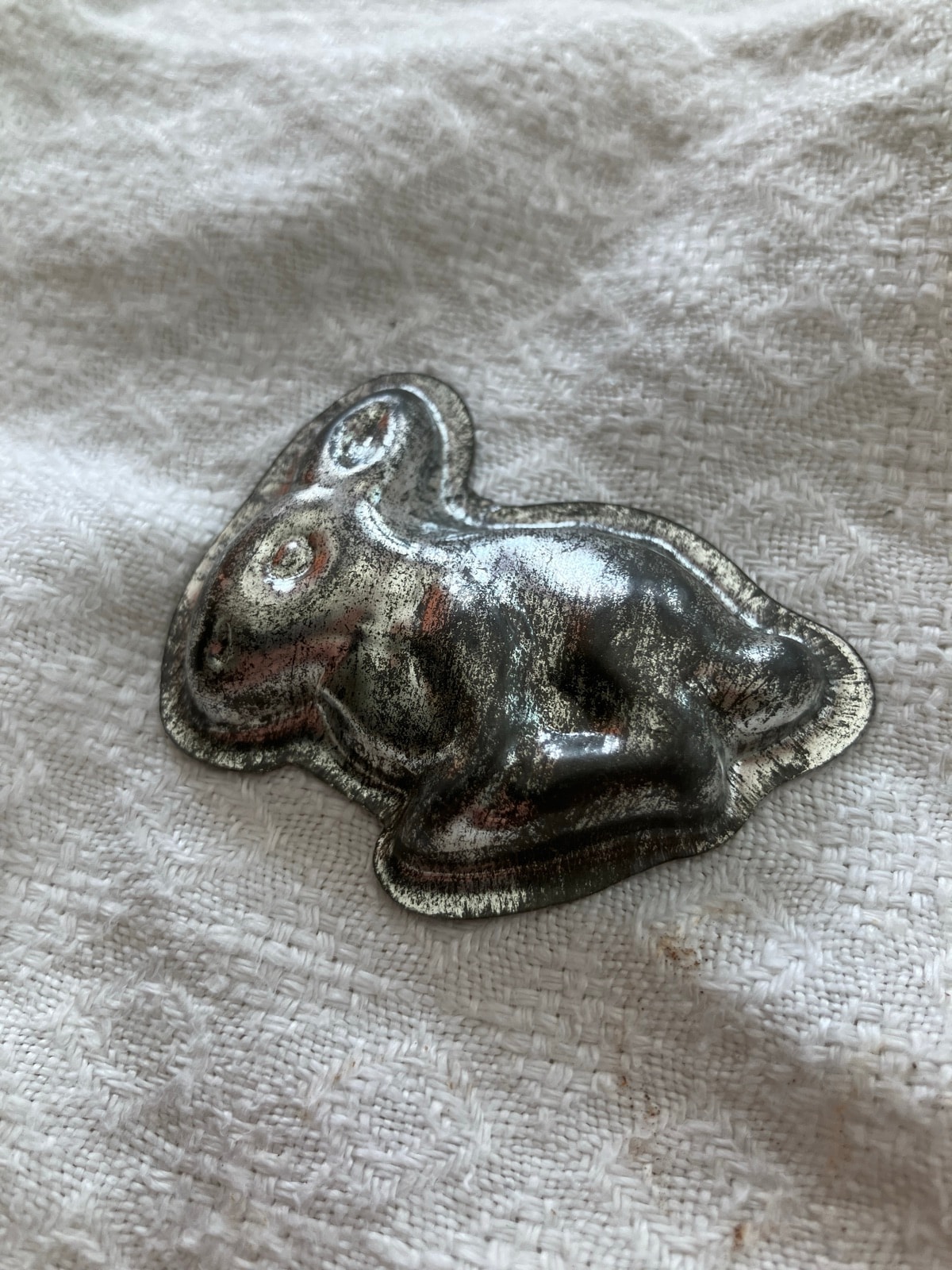 A charming, single-sided tinned-steel confectioner's mold featuring a recumbent rabbit. This piece represents the golden age of European chocolate making, where intricate metalwork met the culinary arts.