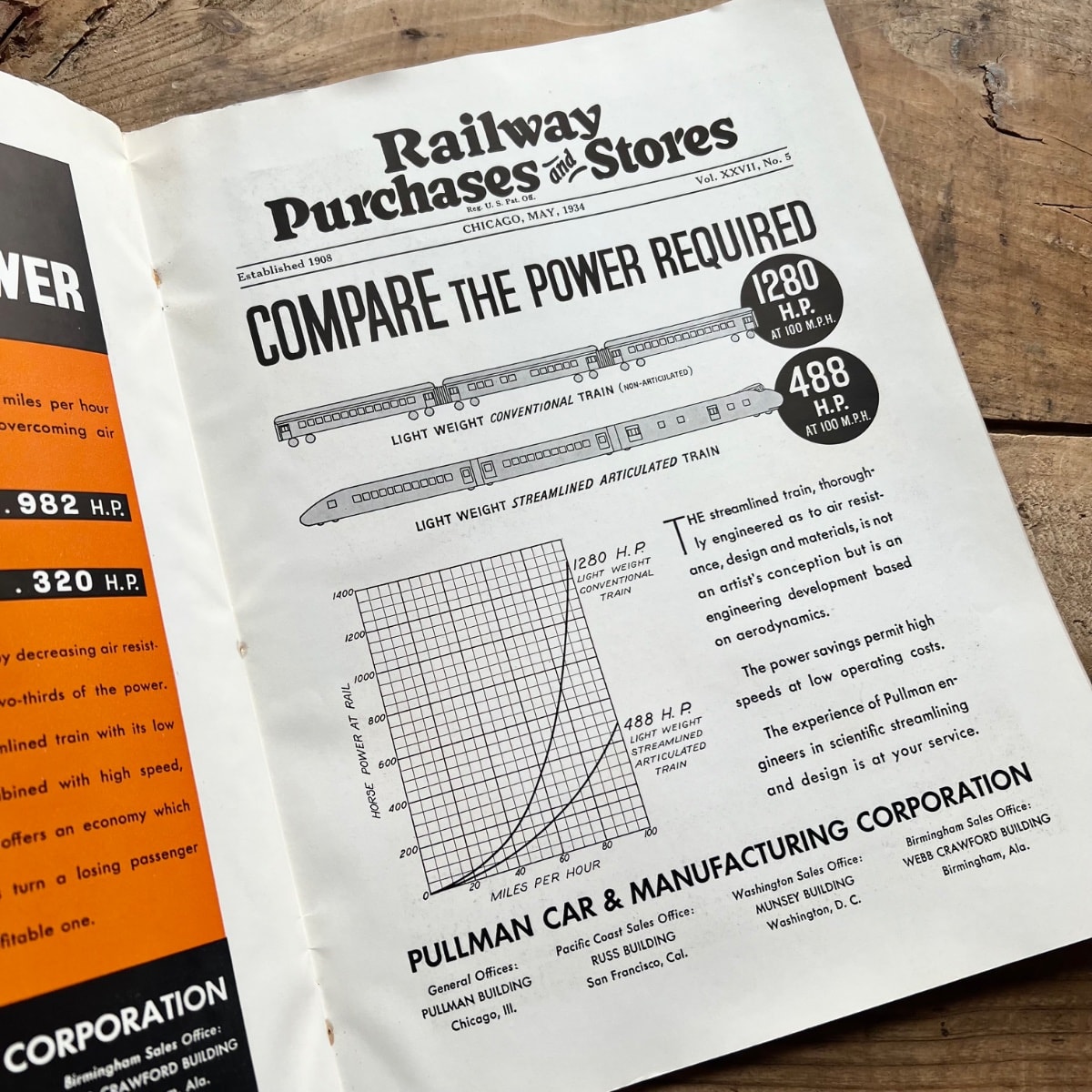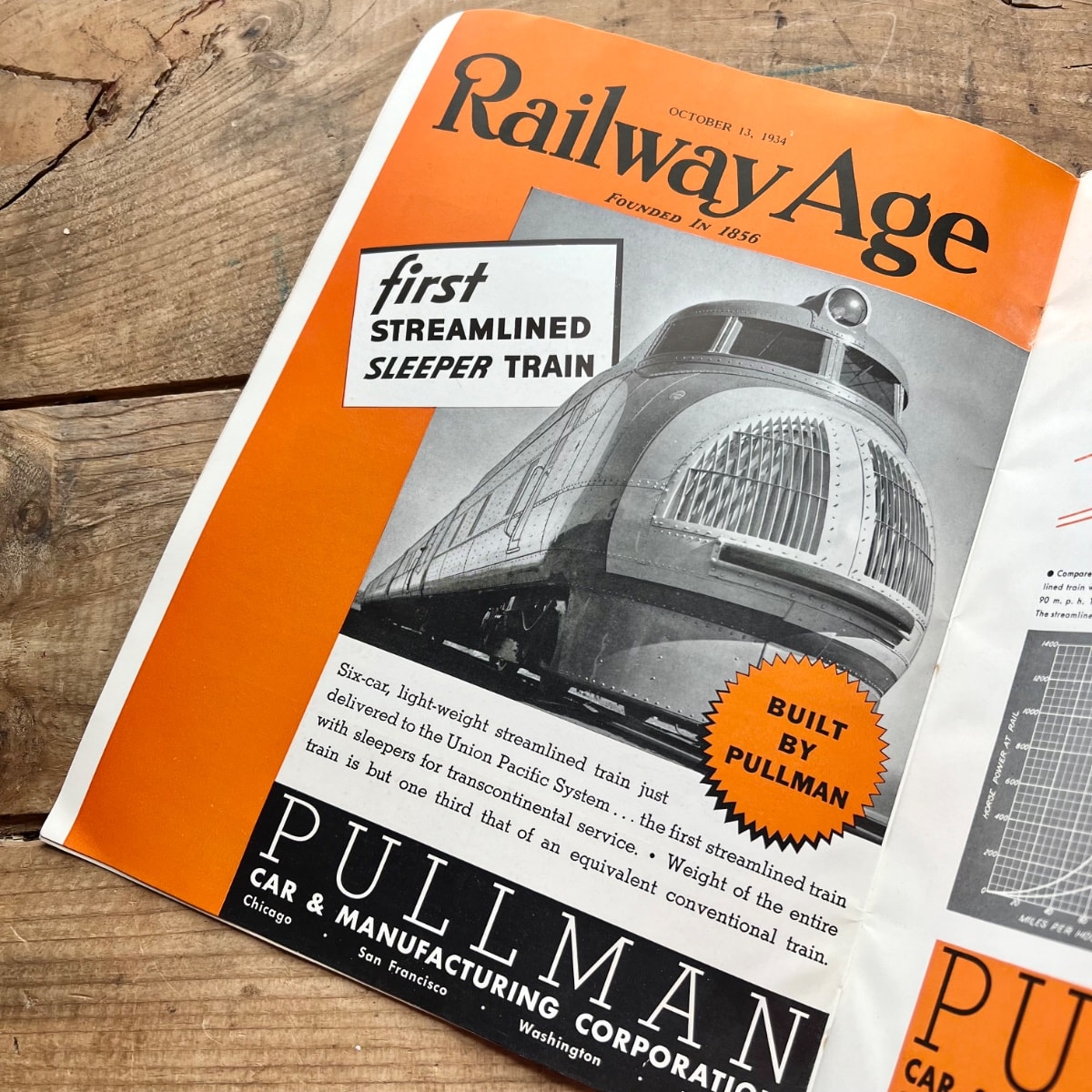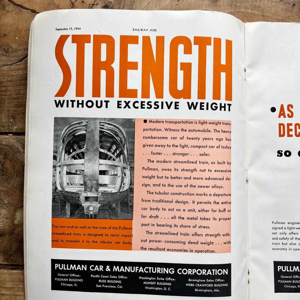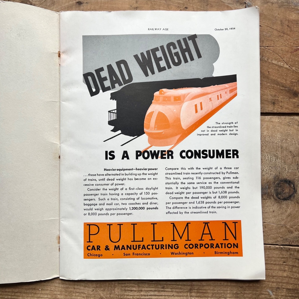 A rare corporate promotional booklet compiling Pullman's 1934 trade advertisements from 'Railway Age' and 'Railway Purchases and Stores'. It showcases the revolutionary transition from heavy, 'dead weight' steam-era cars to the sleek, aerodynamic aluminum-alloy M-10001 streamlined trains.
