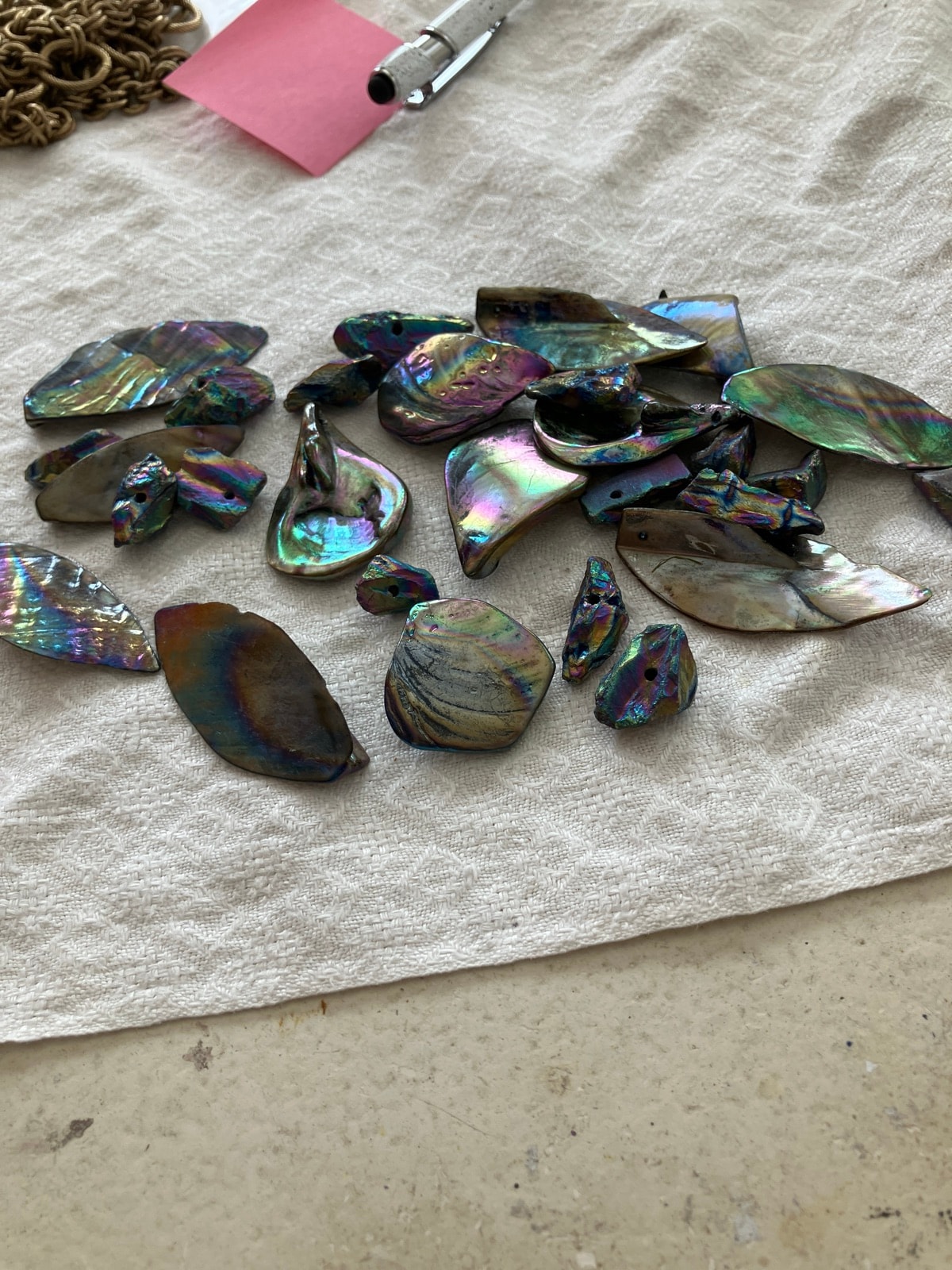 The fragments appear to be in good vintage condition with natural variations in thickness and shape. Some minor edge wear is visible, which is typical for organic shell material. This natural wear does not significantly detract from the value. Value is based on the quantity and the quality of the iridescence.