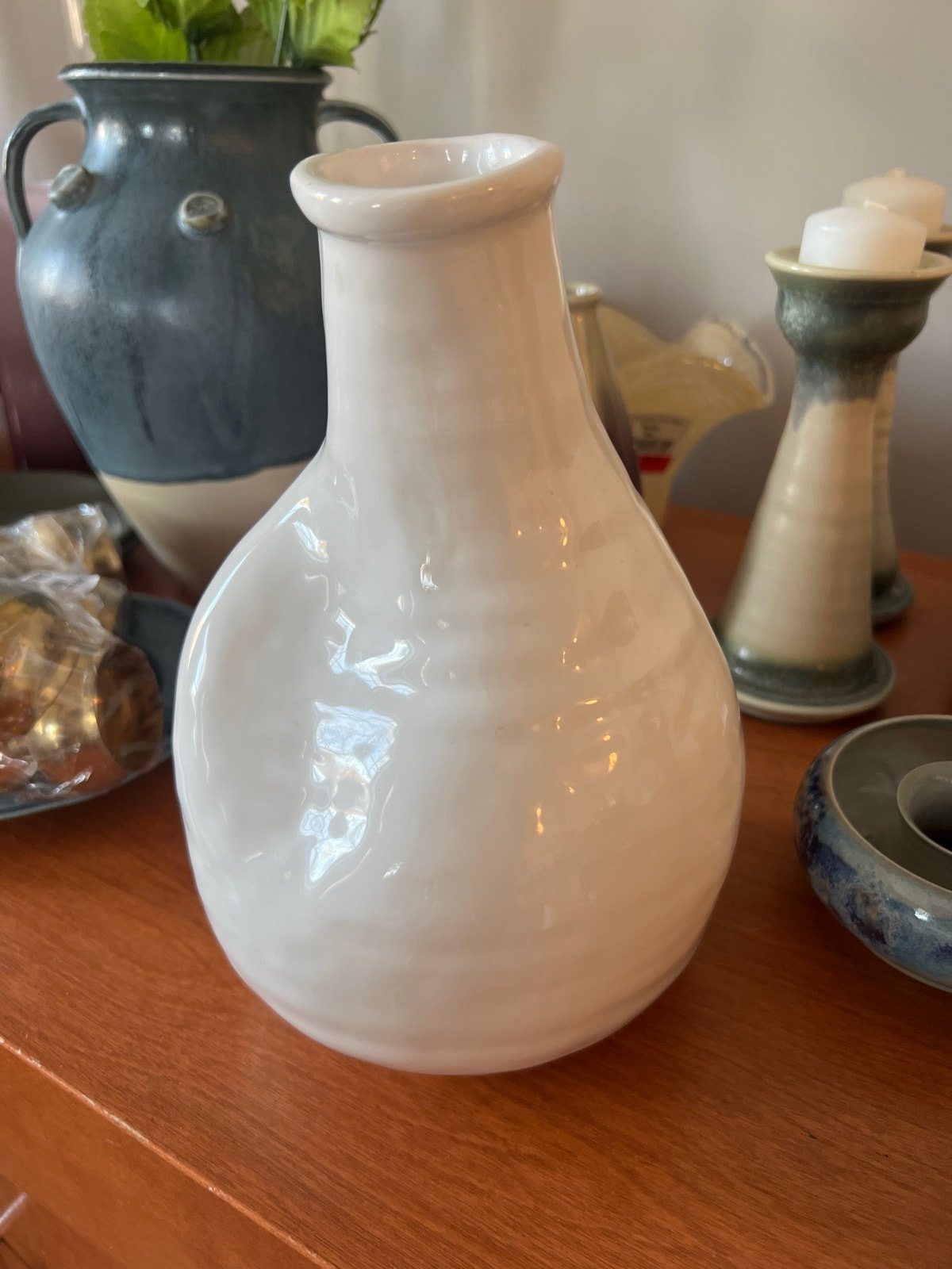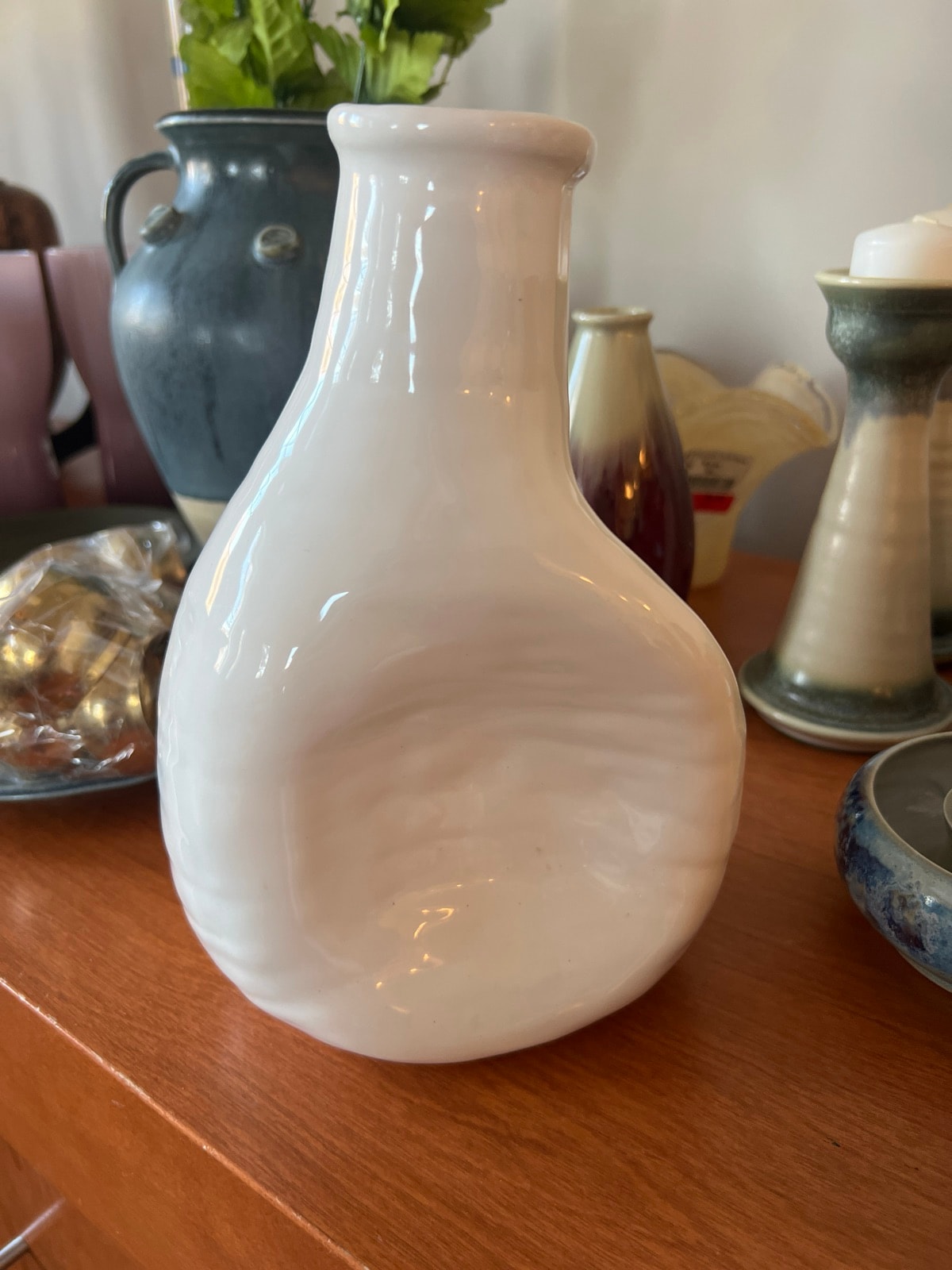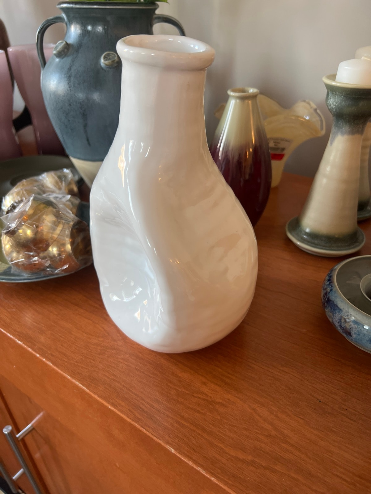 A striking example of 'thrown and altered' studio pottery, this vase features a high-gloss white glaze over a fluid, asymmetrical form. Its most defining characteristic is the deep, intentional indentation on the side, creating a biomorphic shape that challenges traditional ceramic symmetry.