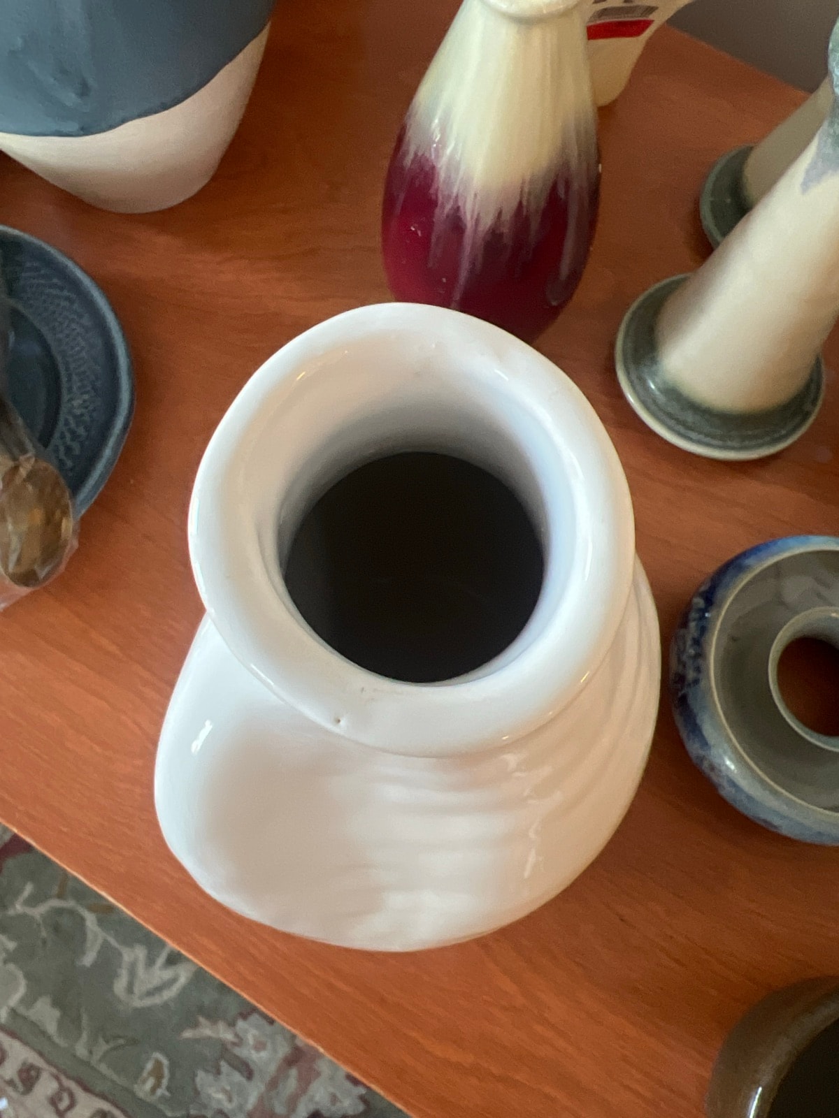 The vase appears to be in excellent vintage condition with no visible chips, cracks, or crazing in the glaze. There is some minor shelf wear and adhesive residue on the bottom which can be easily cleaned. The integrity of the 'altered' section is perfect, with no stress fractures. Excellent condition for a studio piece.
