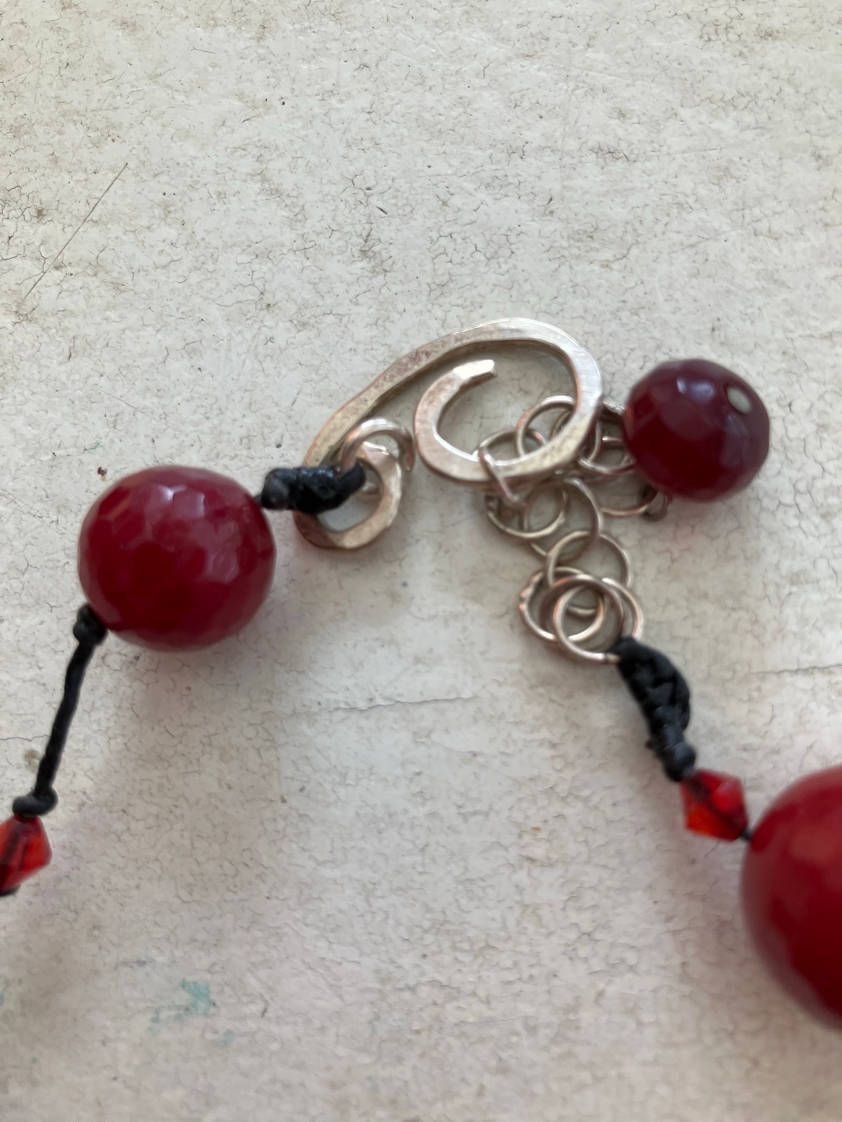 A striking 'tin cup' style necklace featuring faceted red semi-precious stones, likely carnelian or dyed agate, interspersed with bicone crystals on a hand-knotted black cord.