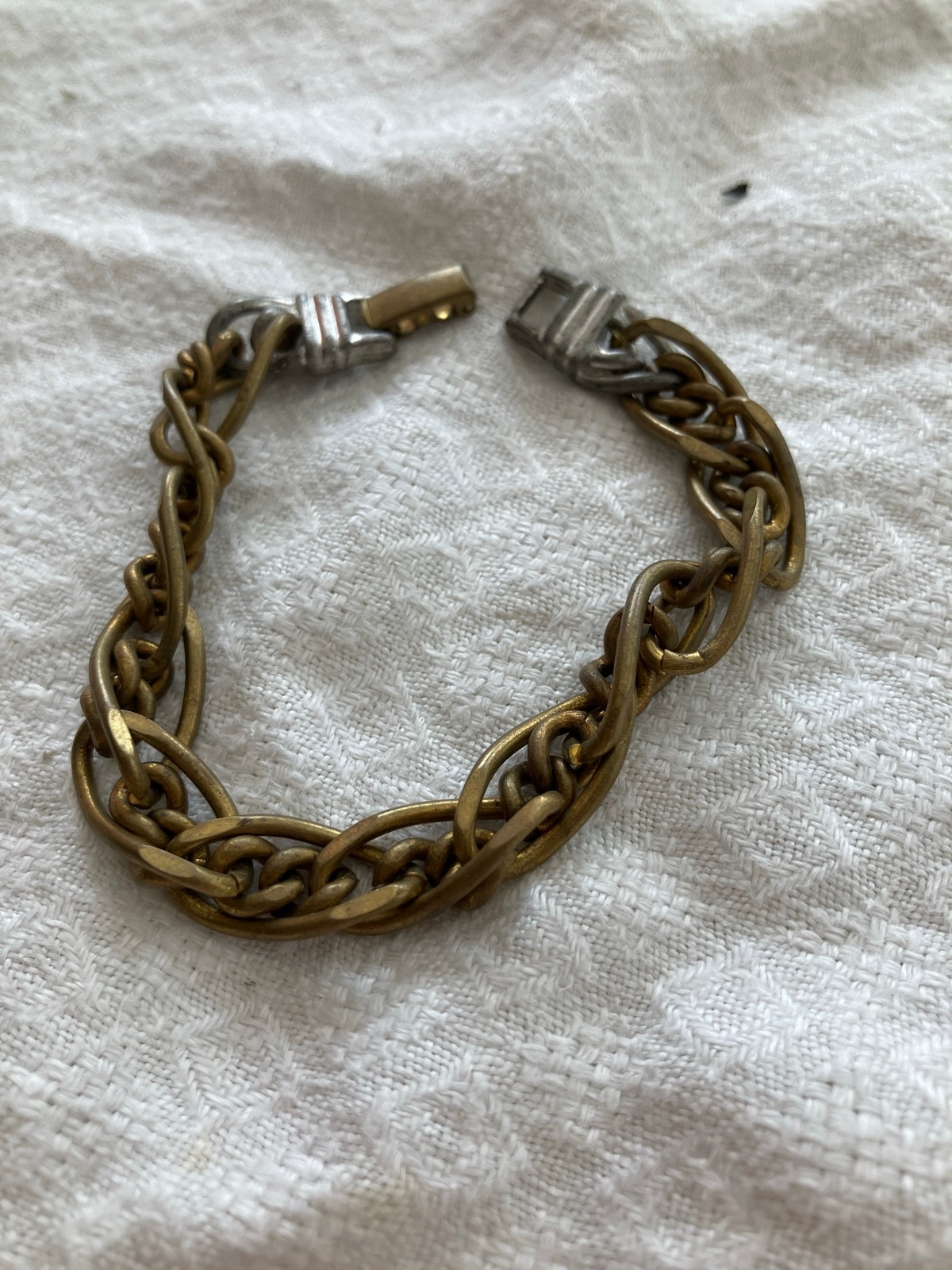 The piece shows a heavy, authentic patina consistent with age. There is some visible wear to the finish on the clasp mechanism, which is common for high-friction areas. This 'aged' look is actually preferred by many collectors of this style. Condition is good and does not significantly detract from value.