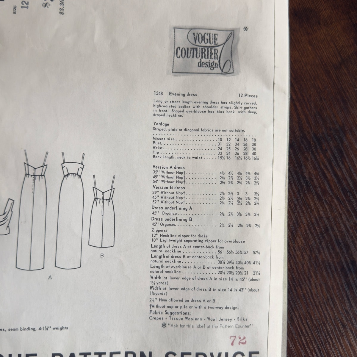 A sophisticated mid-60s evening ensemble featuring a high-waisted gown and a dramatic overblouse with a deep draped cowl back. This 'Couturier Design' series was the gold standard of home sewing, offering the exact blueprints of haute…