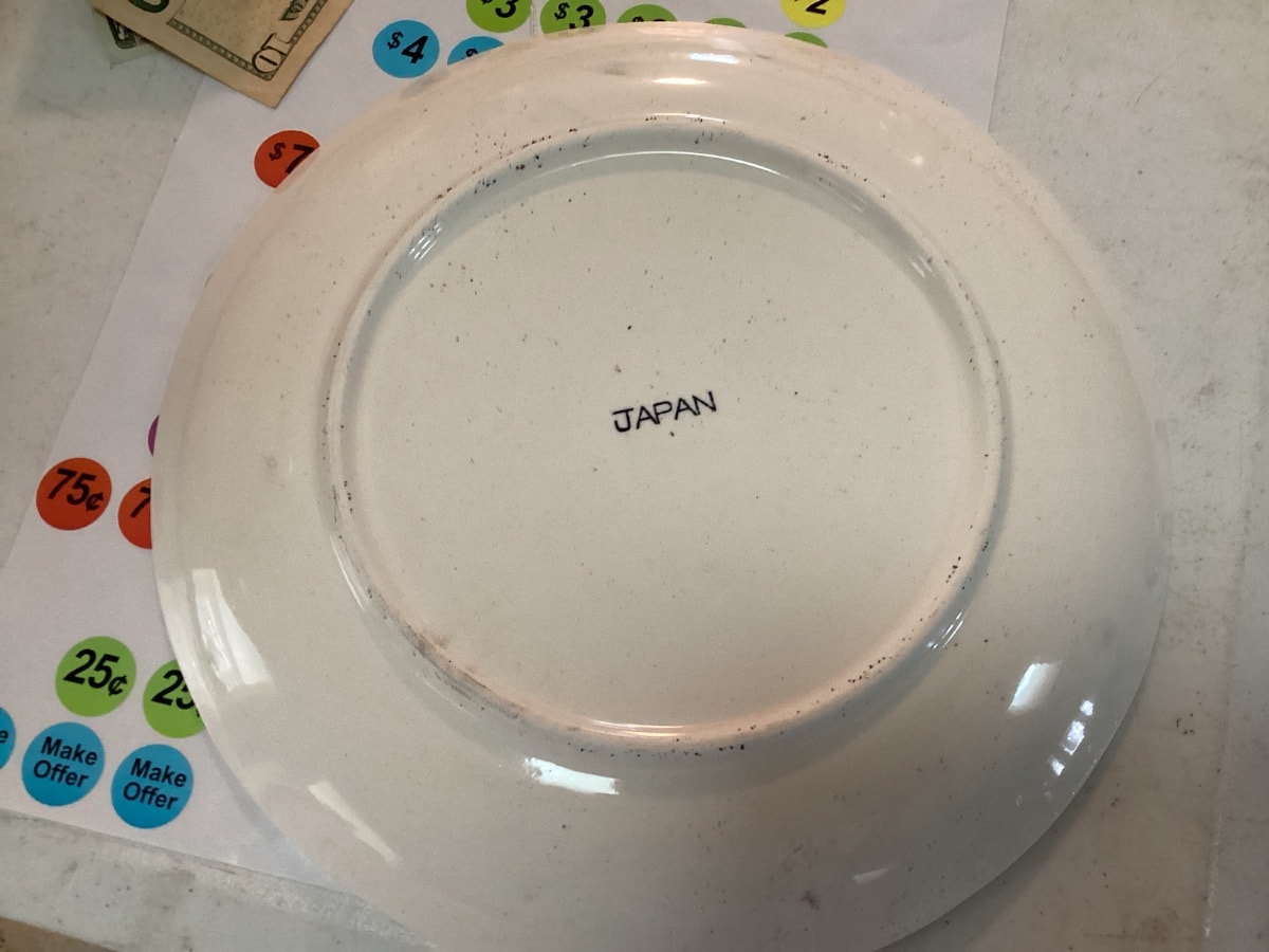 The plate appears to be in good vintage condition with no visible cracks or large chips. There is some minor pitting and 'pepper' spotting on the reverse side, which are manufacturing artifacts common to this grade of ceramic. Condition is consistent with age and does not significantly detract from its modest value.