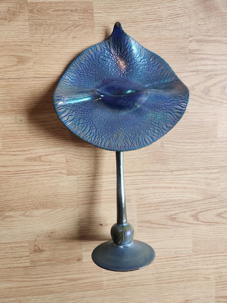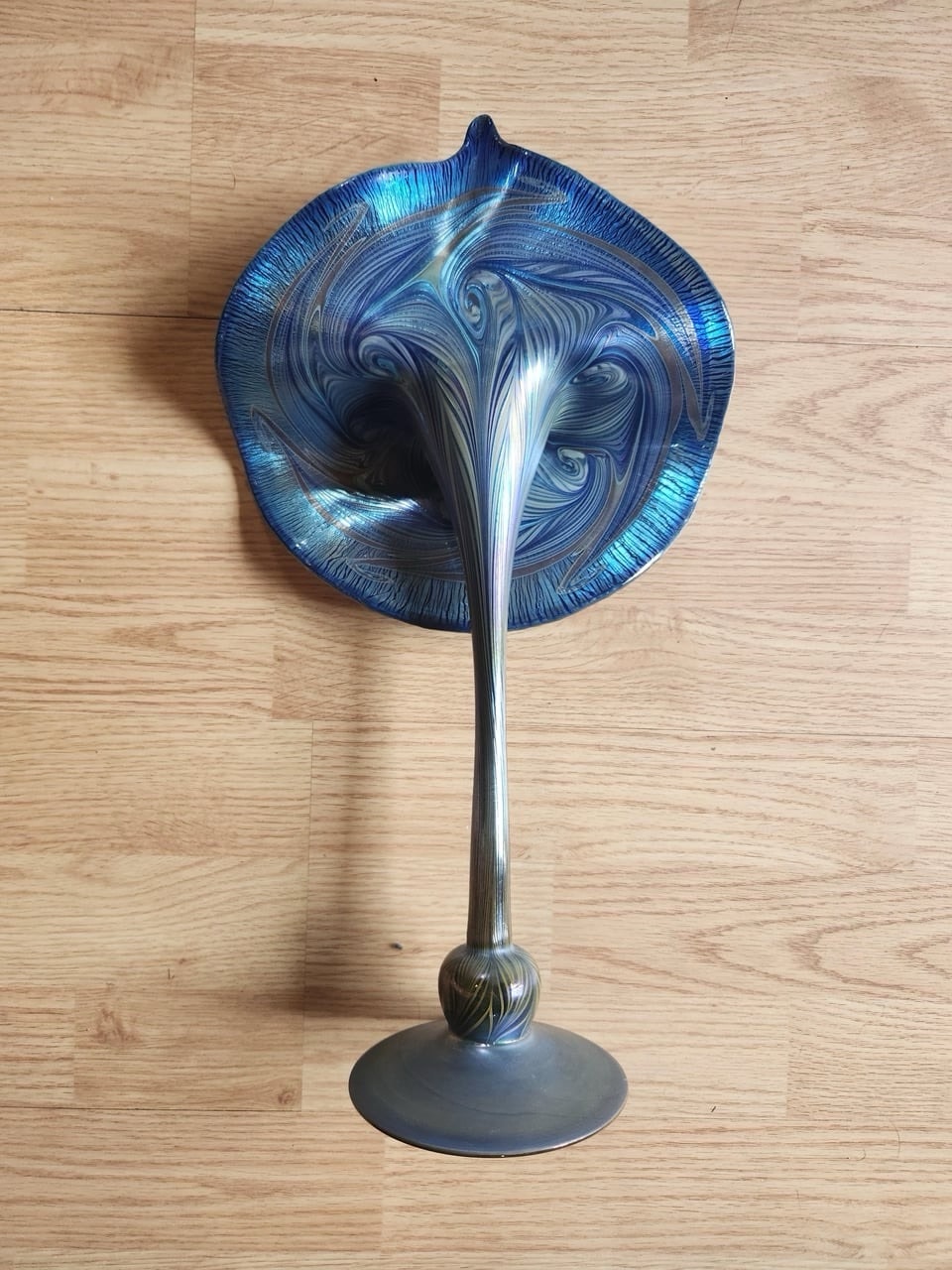 If the piece measures over 18 inches and is executed in rare Peacock Blue Favrile, its Fair Market Value would elevate to the $80,000–$150,000+ range.