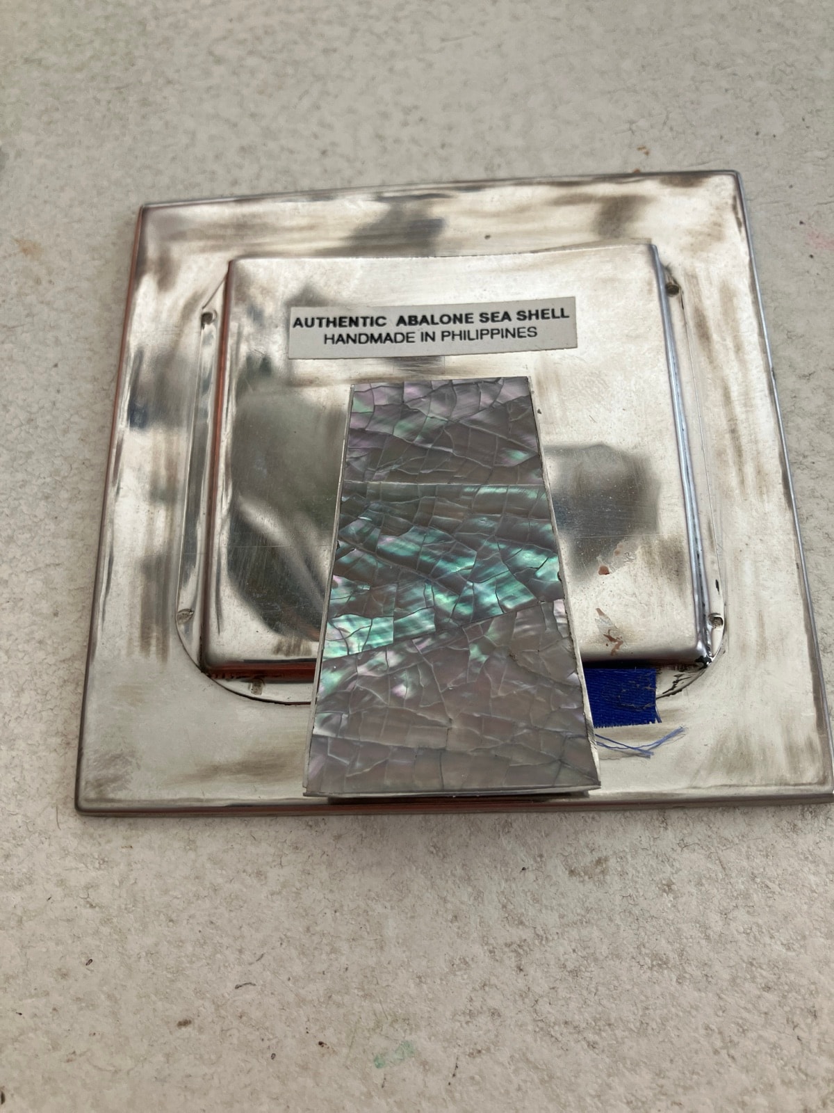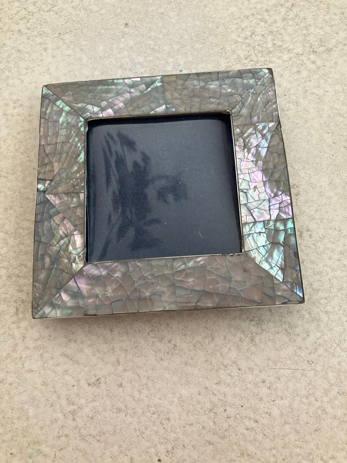 This striking frame features a meticulous 'crackle' mosaic of genuine abalone shell fragments, hand-fitted to create a seamless, iridescent surface. The back and easel are finished in a polished silver-toned metal, reflecting the high-quality export craftsmanship typical of Filipino shell-work from this period.