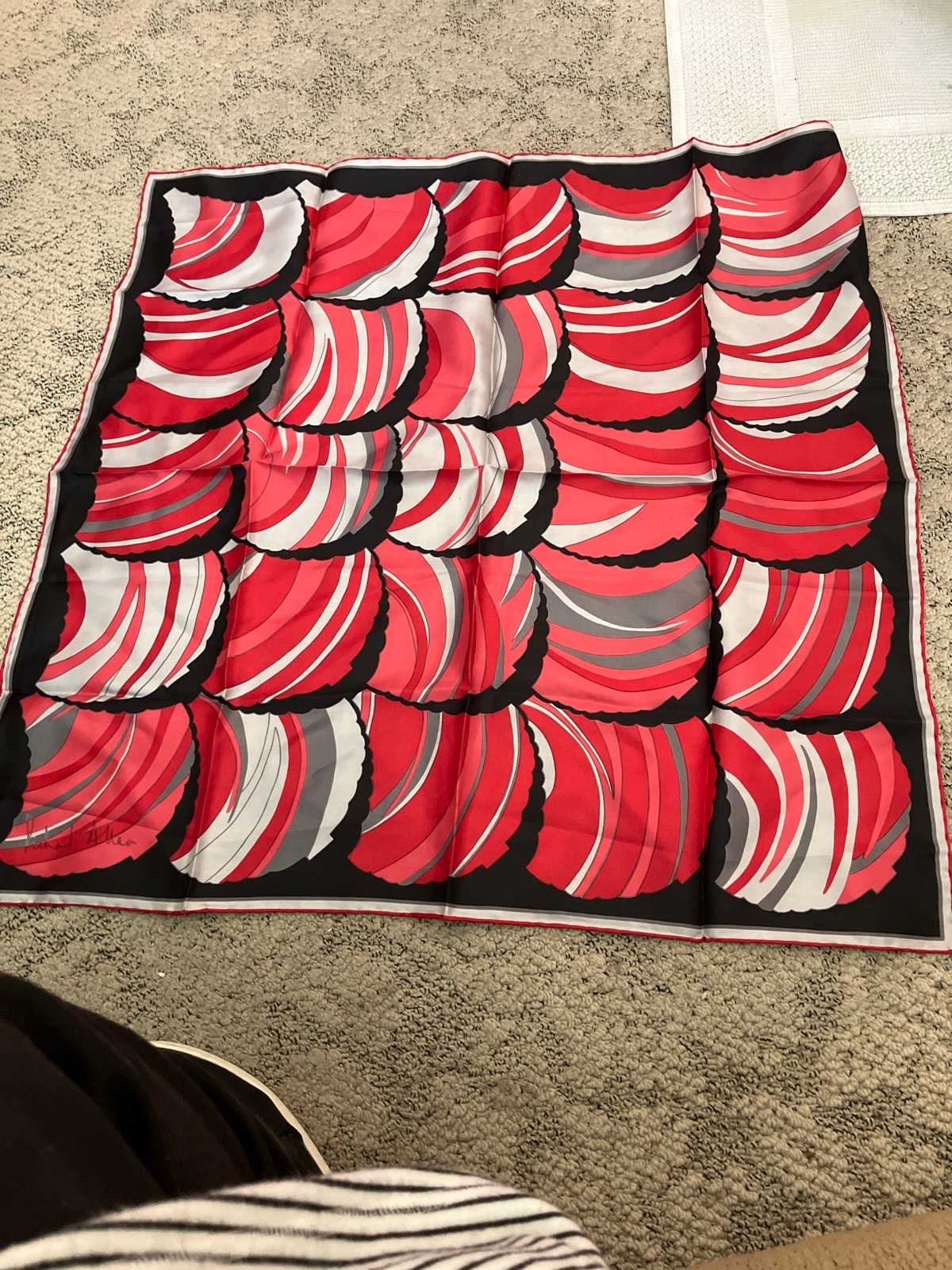 The scarf appears to be in very good vintage condition with crisp colors and intact hand-rolled edges. There are visible fold lines from storage, but no obvious snags or stains; pristine condition significantly bolsters the value for textile collectors.
