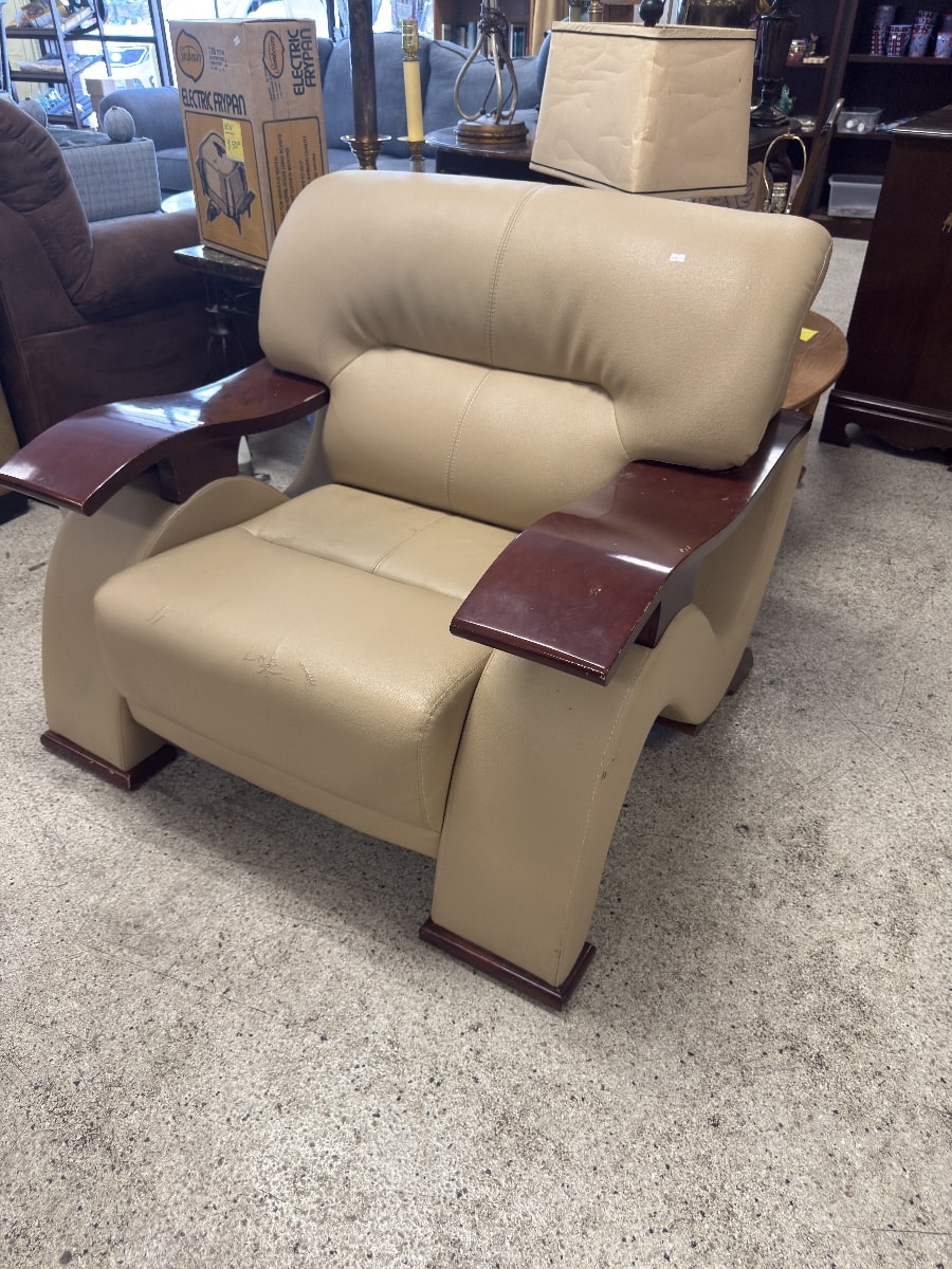 The chair shows significant wear, most notably the cracking and peeling on the front edge of the seat cushion. There are also visible scuffs and finish loss on the wooden armrests and the base. These condition issues reduce the value by approximately 50-60% compared to a mint-condition example.