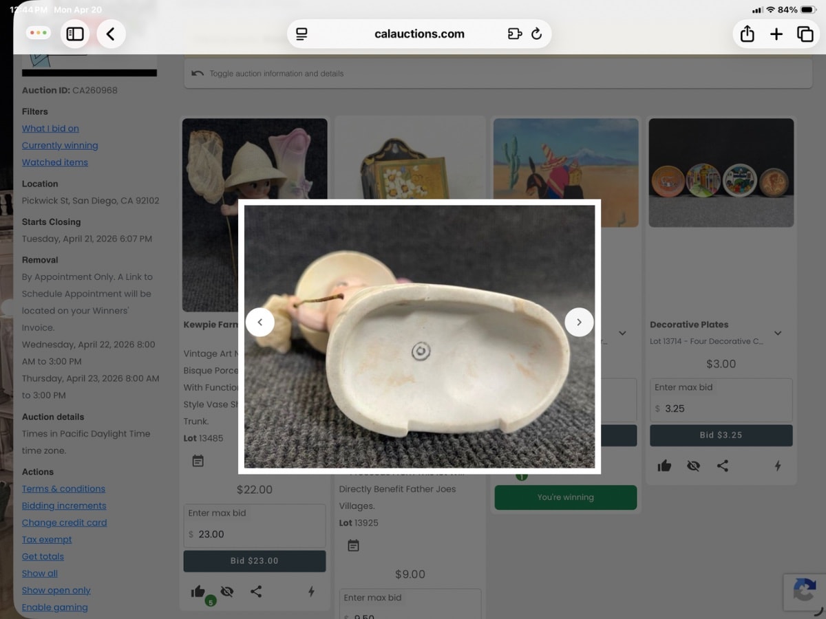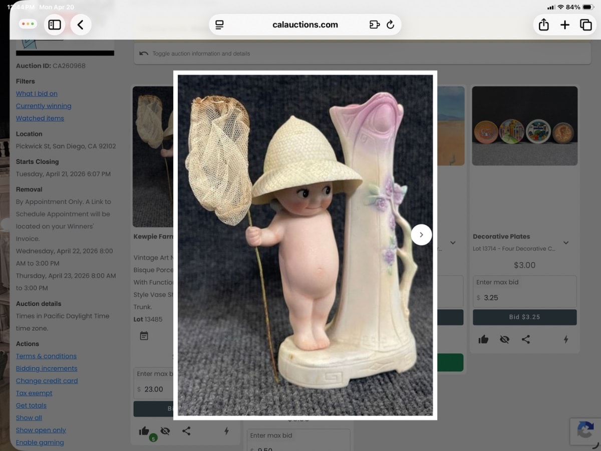 The bisque appears to be in excellent condition with no visible chips to the delicate hat rim or vase petals. The butterfly net shows appropriate age-related darkening and fragility, which actually helps verify its vintage. Some minor surface staining on the base is consistent with age and does not significantly detract from value.
