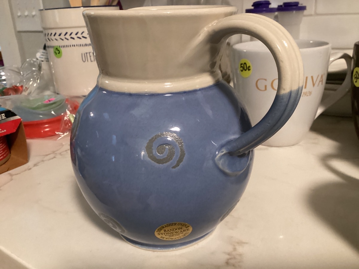 A robust, hand-thrown stoneware pitcher featuring a distinctive two-tone blue and cream glaze with wax-resist spiral decorations. This piece represents the revival of Irish studio pottery, blending traditional utility with modern Celtic-inspired aesthetics.
