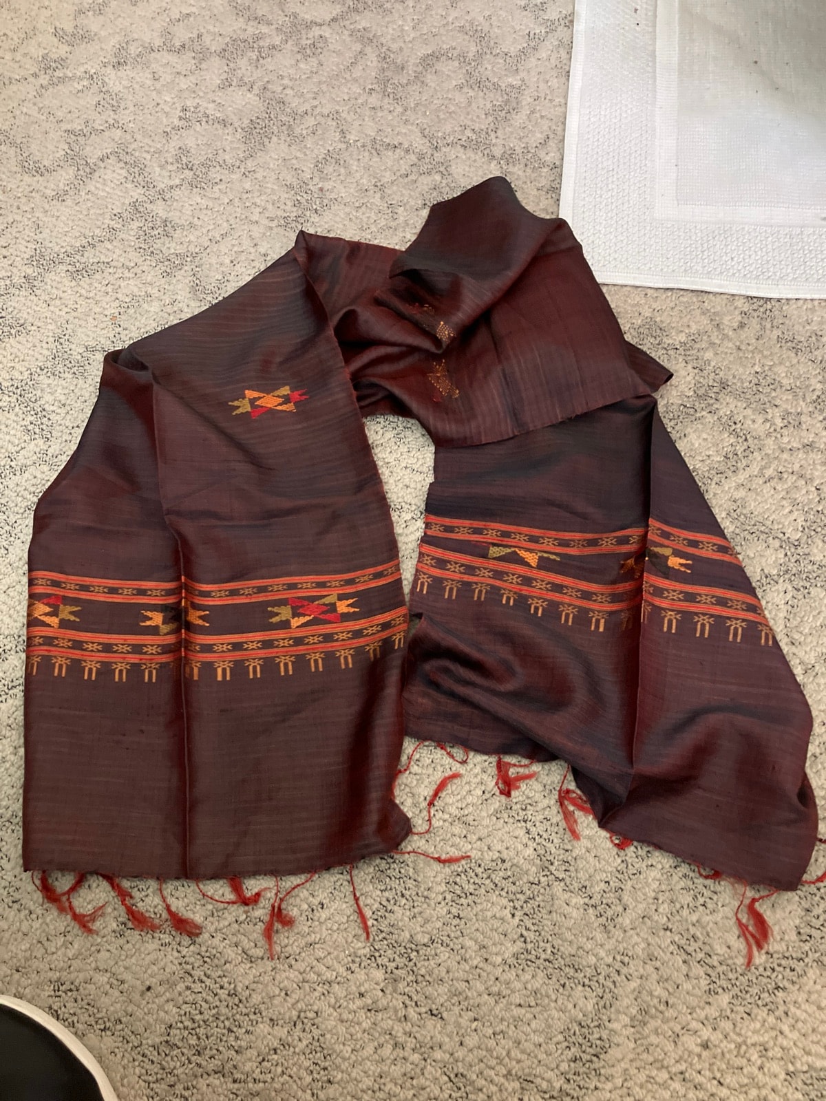 A hand-woven silk textile featuring intricate supplementary weft patterning in a deep madder-red and bronze palette. This 'pha biang' is a traditional ceremonial sash worn diagonally across the chest for festivals, weddings, and Buddhist merit-making ceremonies.
