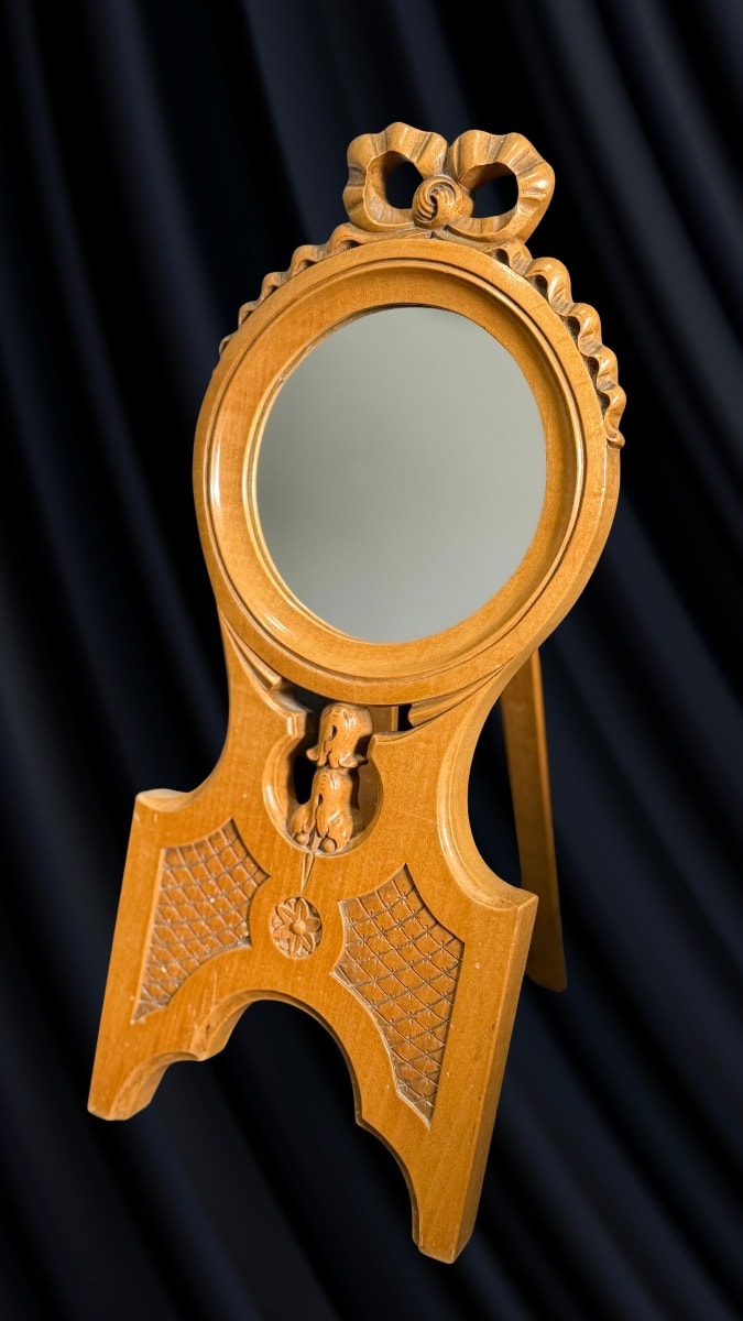 A finely hand-carved wooden vanity mirror featuring a neoclassical bow crest and a charming figural dog nestled in a central cutout. The frame is decorated with intricate cross-hatch 'diaper' carving and a central floral rosette, supported by a sturdy easel back.