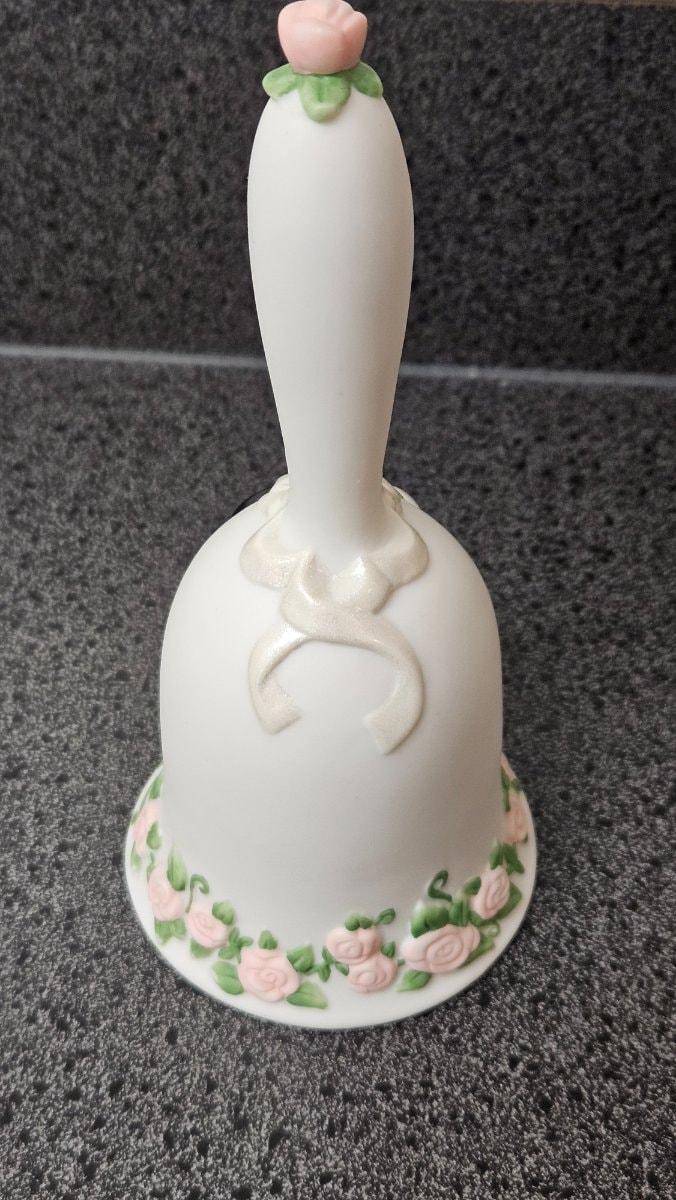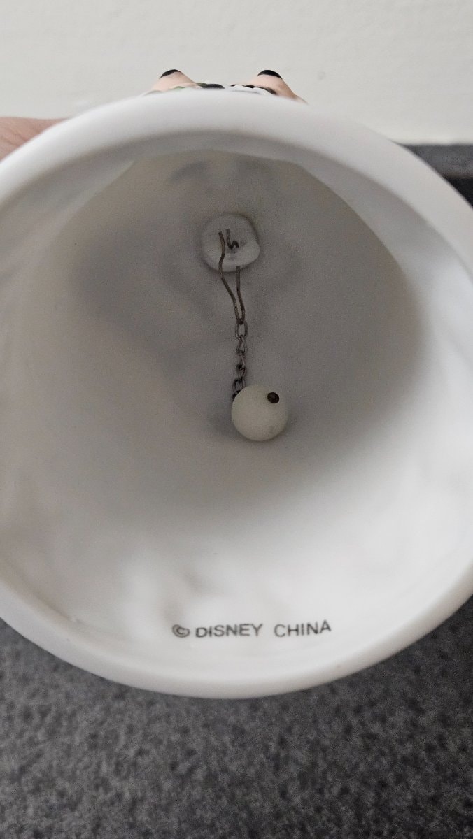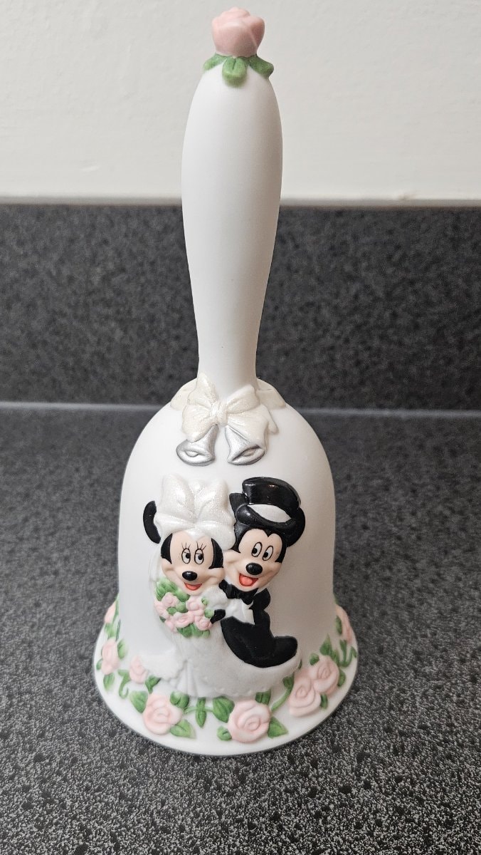 The bell appears to be in excellent condition with no visible chips to the fragile rose petals or character ears. The internal clapper and chain are intact, which is vital for both functionality and collector value. Condition like this commands the higher end of the range.