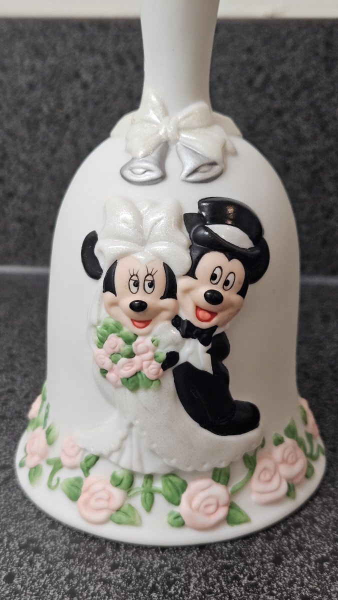 This charming bisque porcelain bell features three-dimensional figures of Mickey and Minnie Mouse in their wedding finery, framed by a hand-painted garland of pink roses. The matte 'bisque' finish provides a sophisticated texture, while the handle is elegantly topped with a single sculpted rosebud.