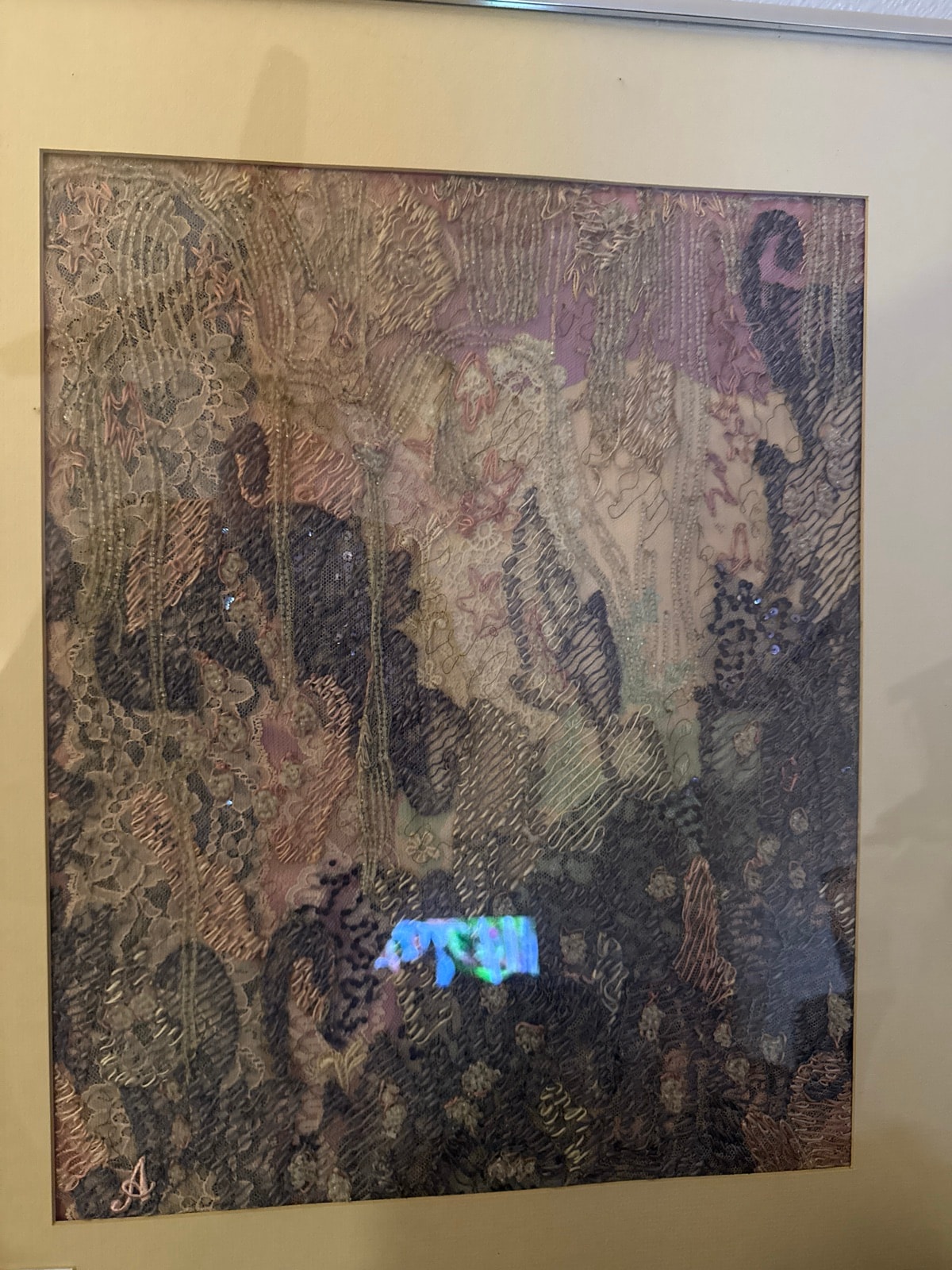 An intricate, layered textile collage featuring a dense assemblage of vintage lace, hand-stitched sequins, and delicate embroidery. This piece is a masterclass in texture, using varying weights of lace and shimmering accents to create a dreamlike, almost underwater aesthetic.