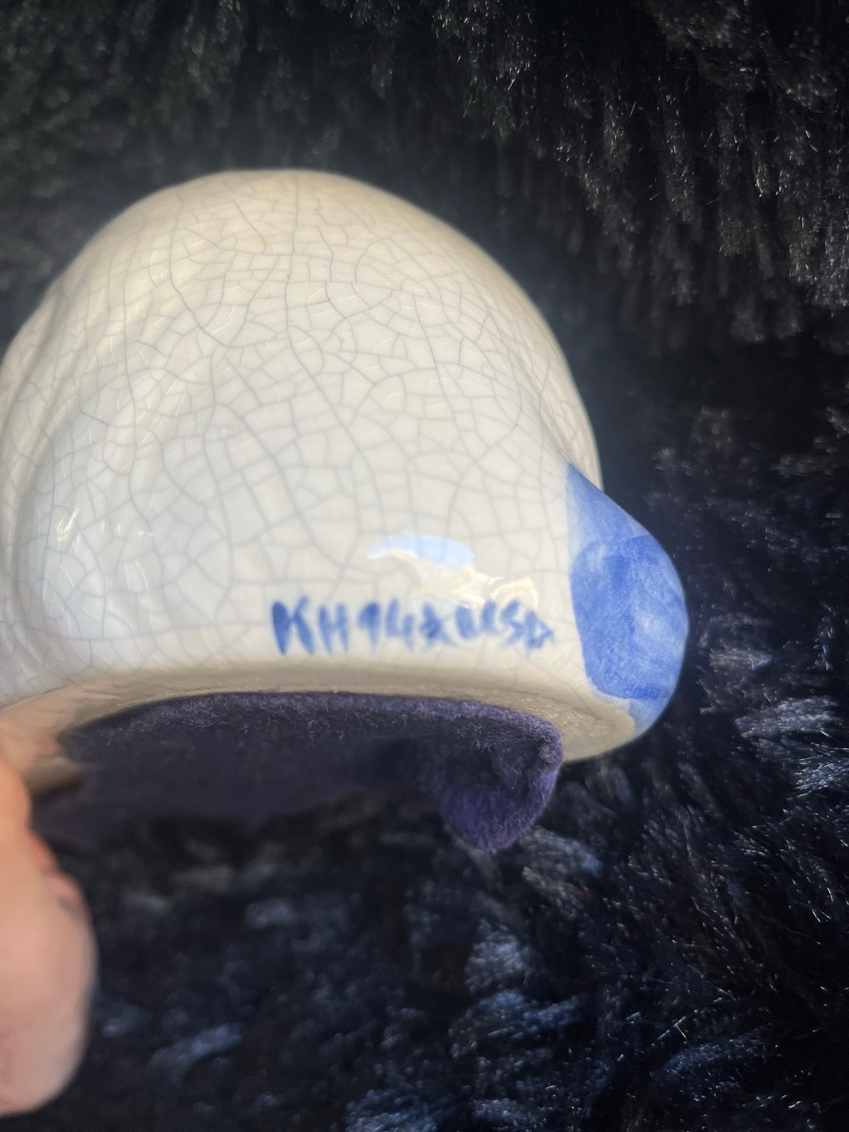 The piece shows a very uniform crackle glaze which is an intentional artistic choice, though there is a small glaze skip or flake visible near the signature on the back. The felt bottom suggests it was well-cared for as a display piece.