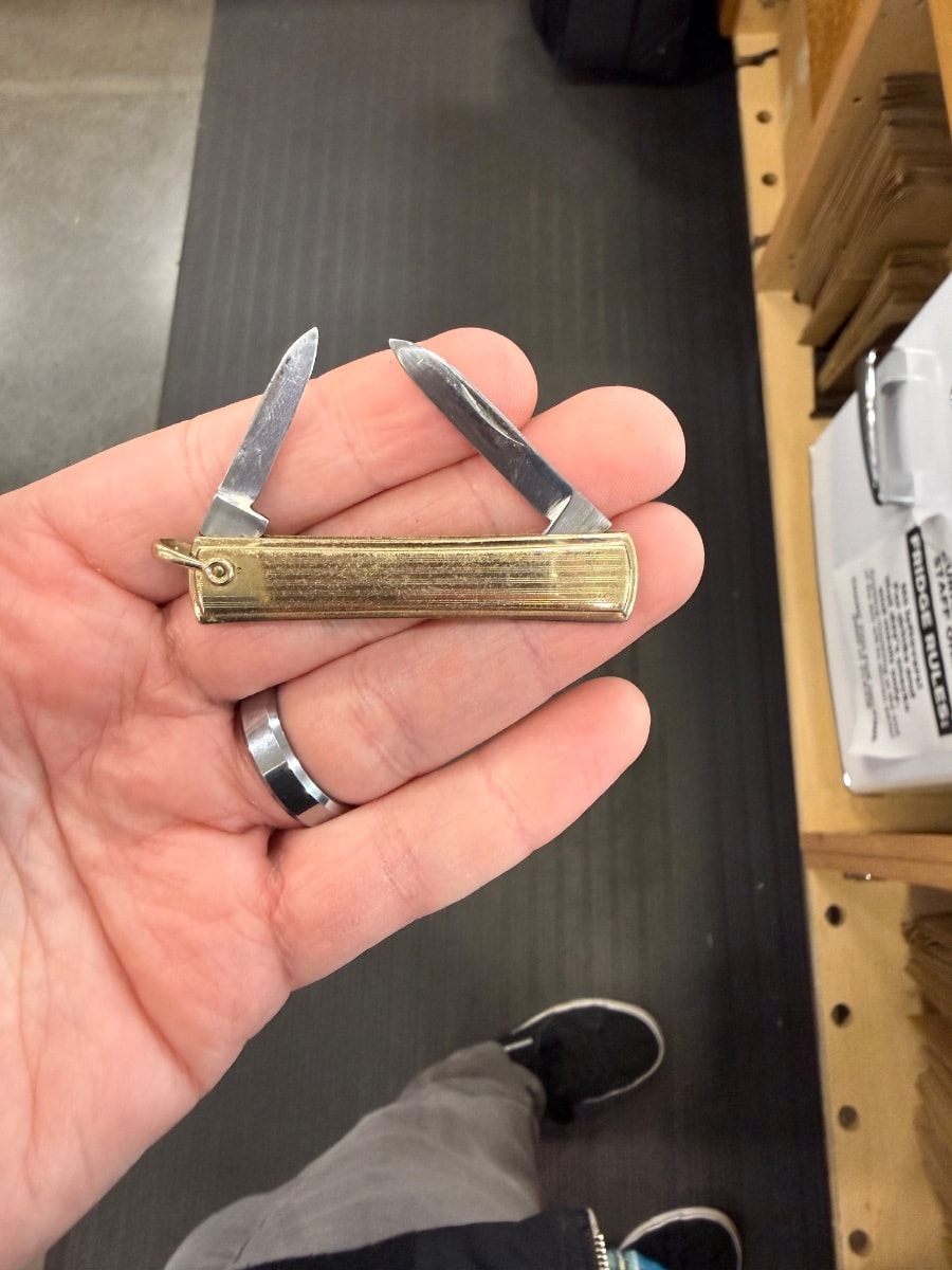 The casing shows a beautiful aged patina with some expected surface wear to the gold layer. The blades appear intact but show some darkening; check for 'snap' when closing to ensure the internal springs aren't fatigued. This wear is consistent with a piece that was actually carried and used for decades.