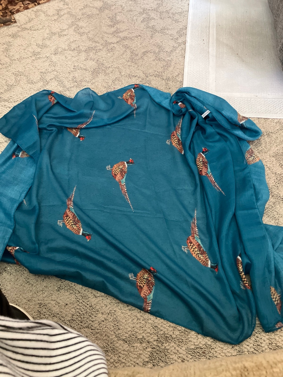 A large-format shawl scarf featuring a repeating Ring-necked Pheasant motif on a deep teal ground. This piece captures the 'Country House' aesthetic, blending sporting tradition with functional fashion.