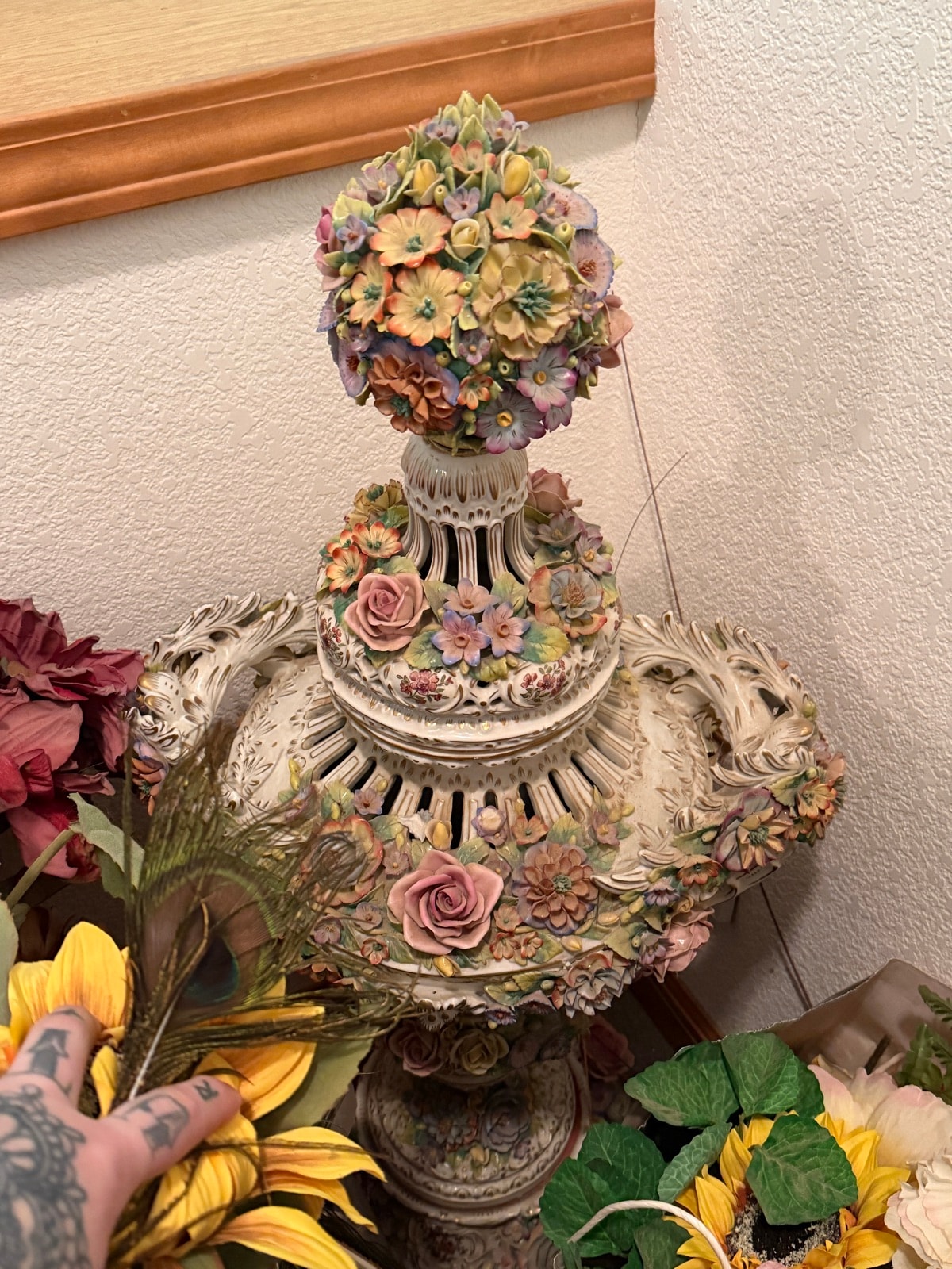 This is a monumental example of 'fleurs en relief' or encrusted porcelain, featuring hundreds of individually hand-modeled blossoms.