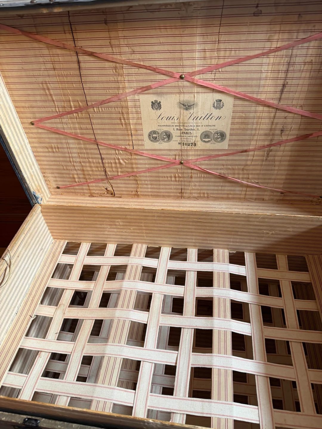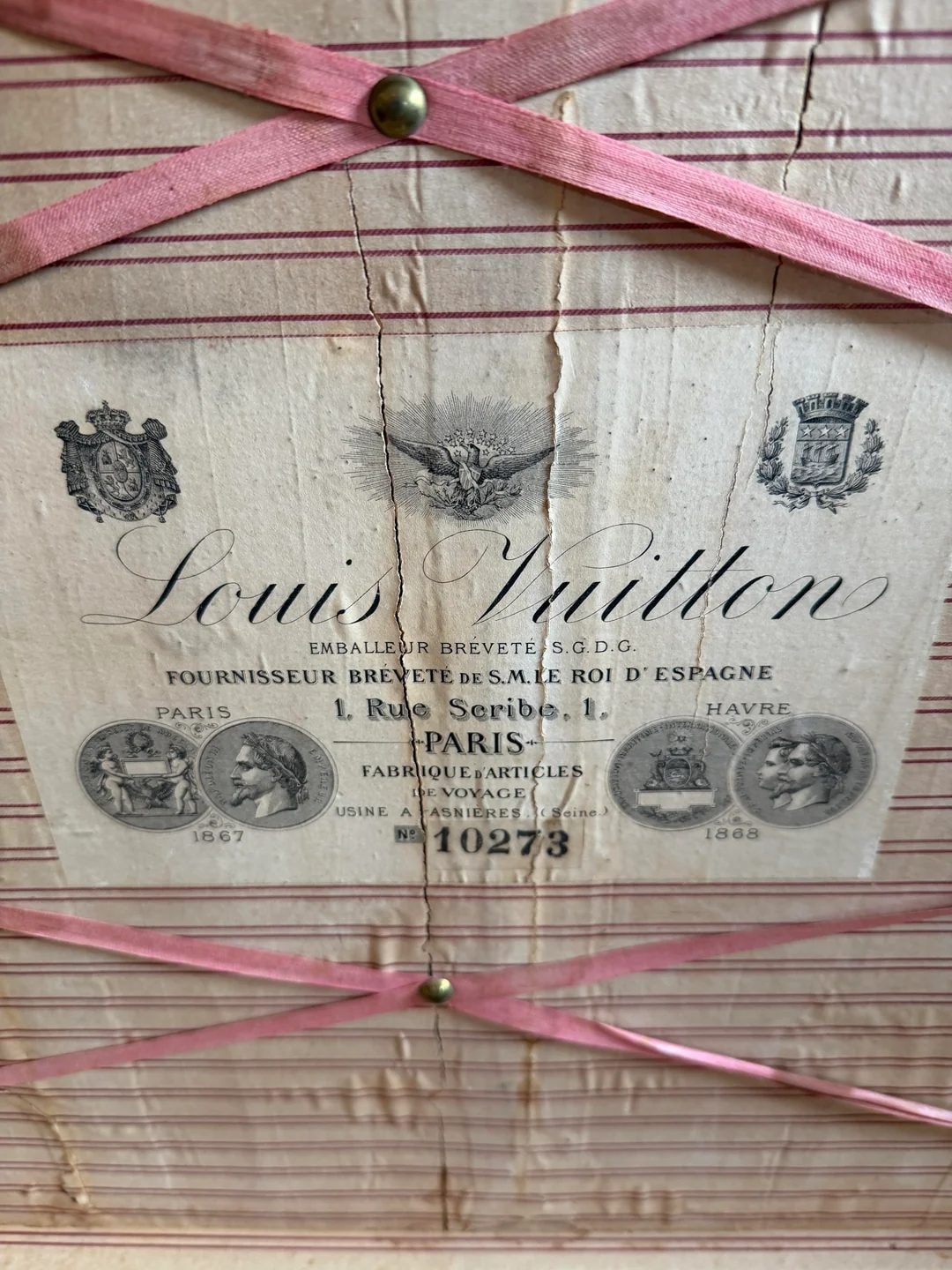 1871 marked a turning point when Louis Vuitton moved to 1 Rue Scribe. This trunk, serial 10273, features the 'Gris Trianon' canvas used before the famous monogram existed. Its stickers trace a journey through Europe's grandest hotels.