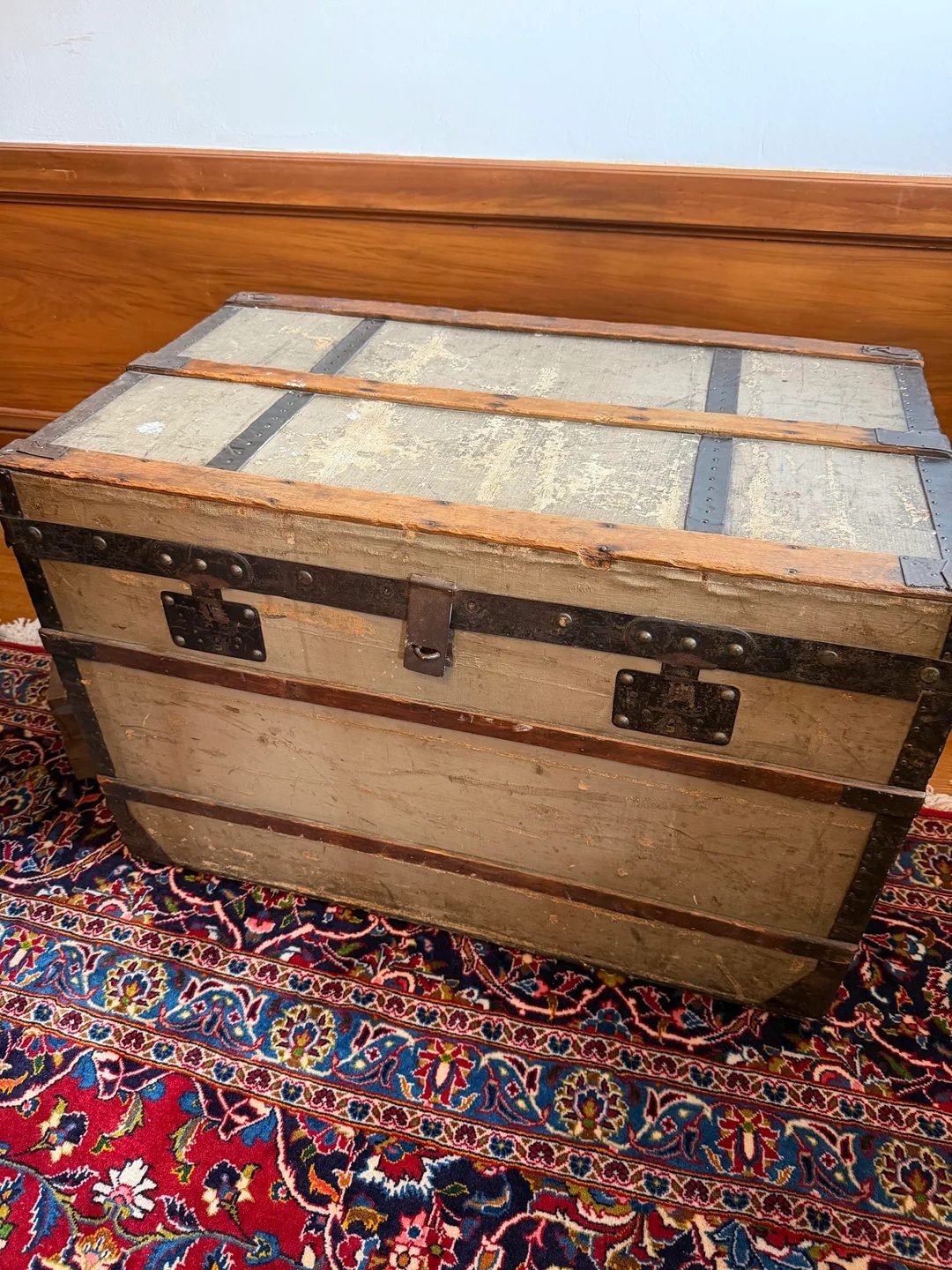 The exterior shows significant 'honest' wear, including staining to the canvas and oxidation on the iron hardware, which many collectors prefer over heavy restoration. The interior label is remarkably well-preserved despite a vertical crack, and the ribbon lattice remains intact.