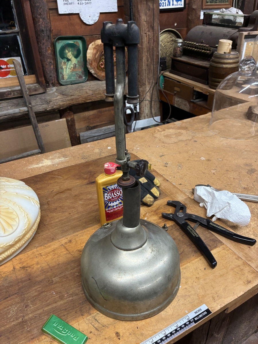 The nickel plating shows significant oxidation and 'brassing' where the base metal is peeking through. The burner assembly appears intact but the generator and valve will likely need a full rebuild to be functional. Missing its original shade and globe.