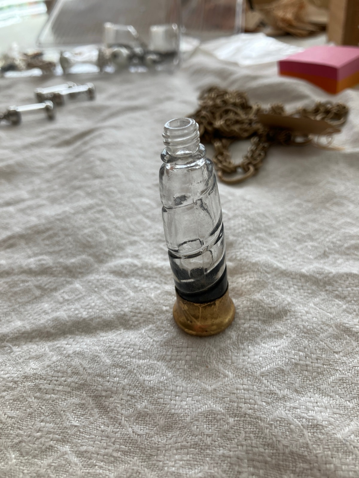 Victorian cities were notoriously pungent, leading ladies to carry these 'scent' bottles filled with aromatic oils or smelling salts. This spiral design was a popular motif, catching the light to mimic expensive crystal.