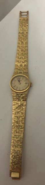 The watch shows honest wear consistent with age, including a notable diagonal scratch on the bracelet just below the 6 o'clock position. There appears to be some thinning of the gold plating on the high points of the texture. The dial looks remarkably clean, which is a big plus for collectors.