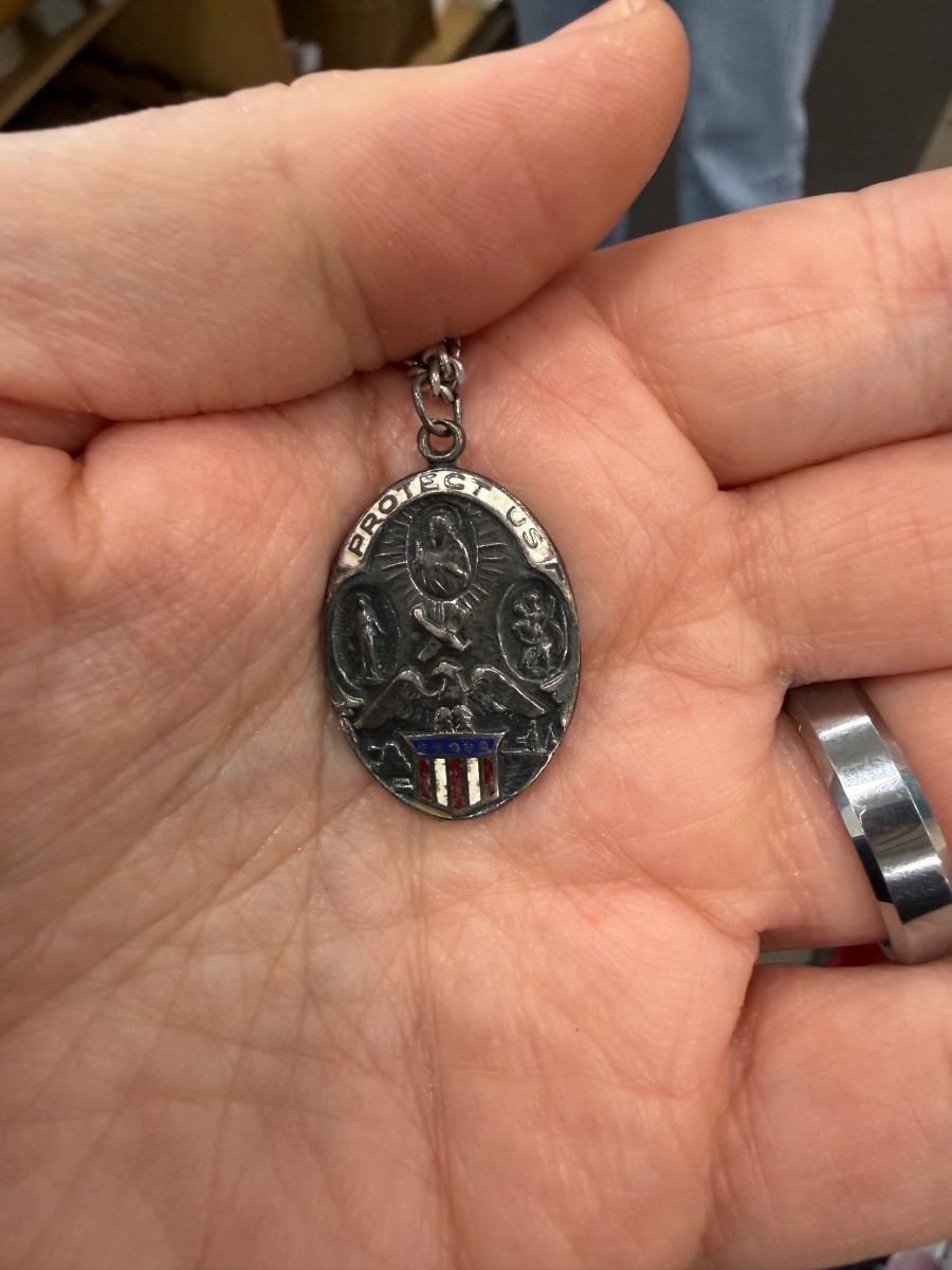 During the 1940s, thousands of these medals were tucked into the pockets or worn under the uniforms of GIs heading overseas. They served as both a spiritual armor and a practical 'calling card'—the back often bore the urgent plea: 'I am a Catholic, please call a priest.' It was a silent bridge between a soldier's faith and their service to their country.