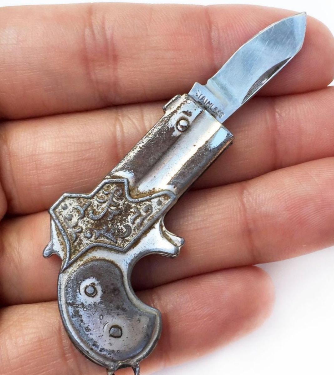 This is a classic piece of mid-century 'pocket jewelry,' a miniature folding knife cleverly disguised as a pocket derringer.