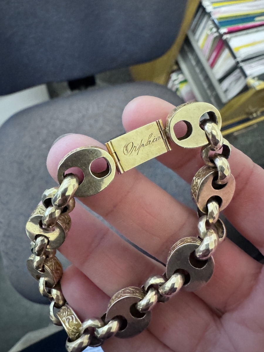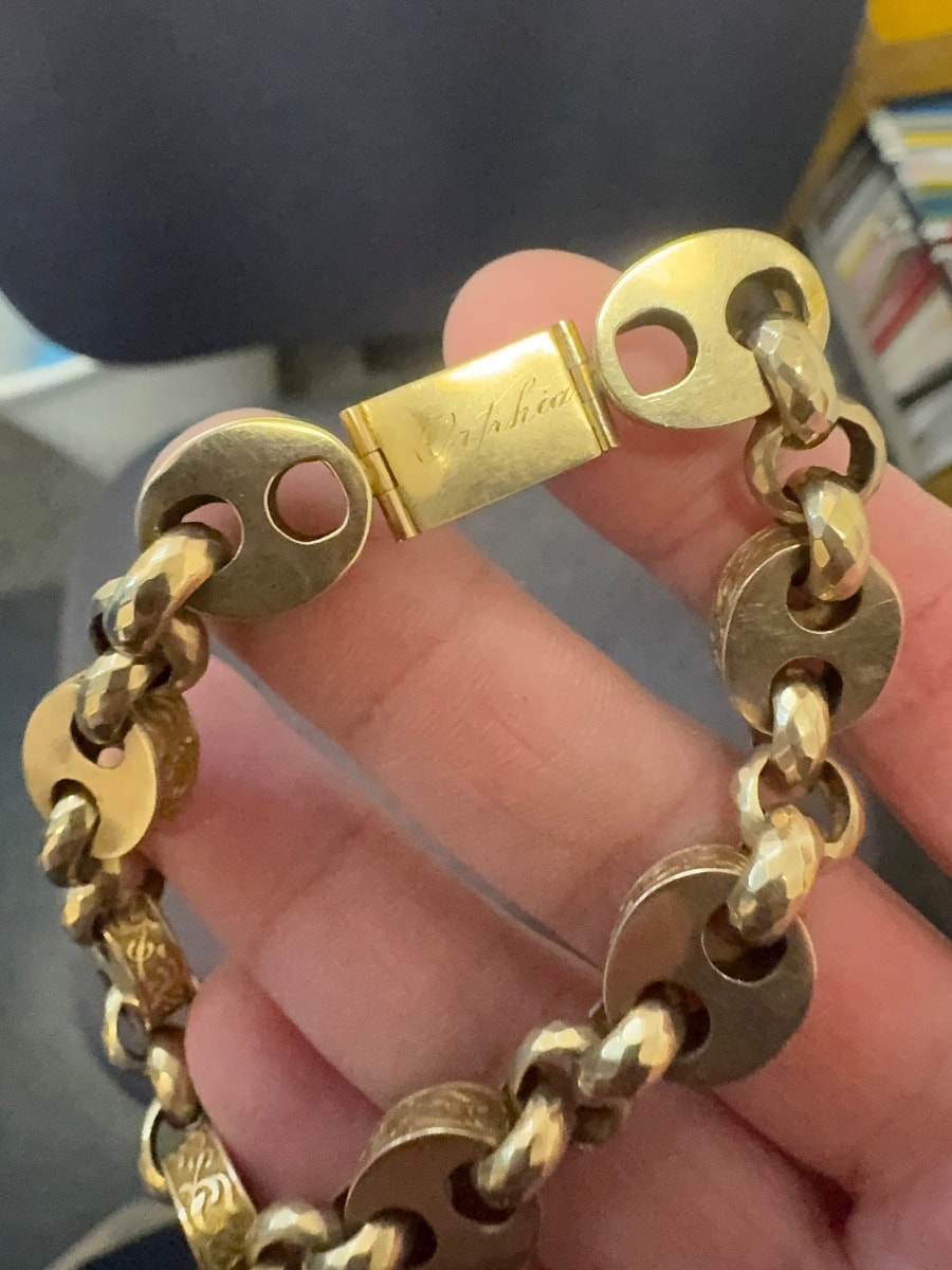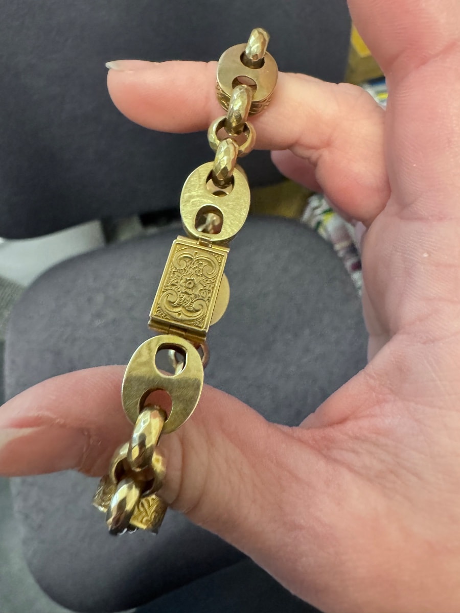 The bracelet shows beautiful age-appropriate patina. There is some light 'brassing' (wear to the gold layer) on the high points of the links, which is expected. The hinge appears functional and the engraving is crisp. Condition is very good for its age.