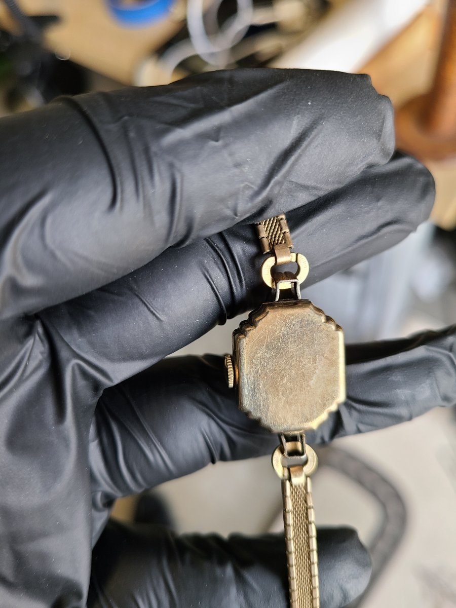 The case shows visible 'brassing' or wear-through on the gold-filled finish, particularly on the high points of the lugs and the case back. The dial has developed a soft, authentic patina consistent with its age, and the crystal appears to have minor surface scuffs.