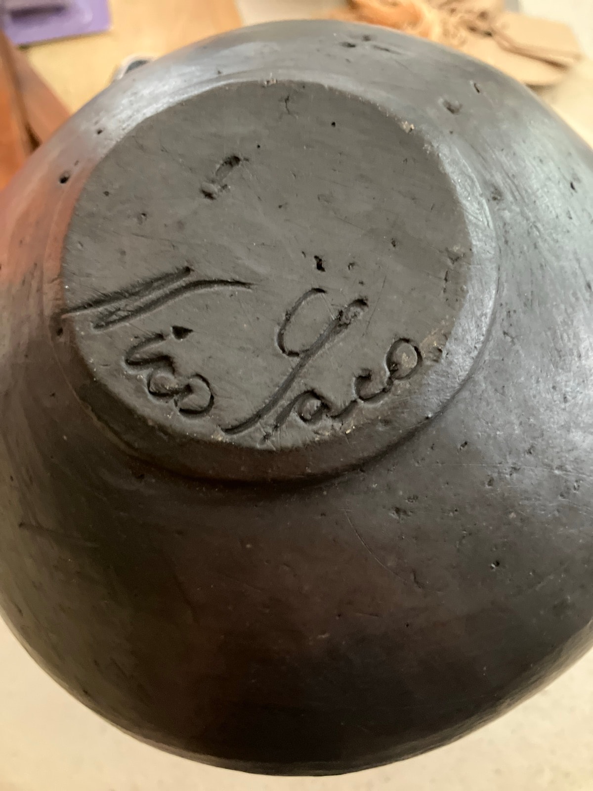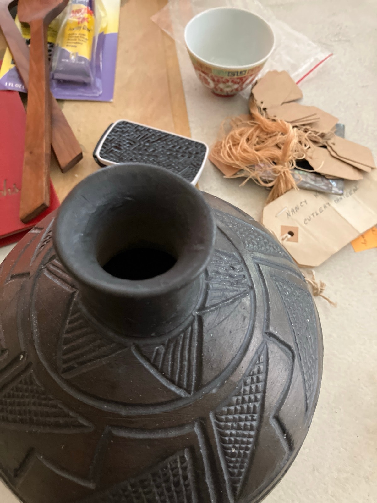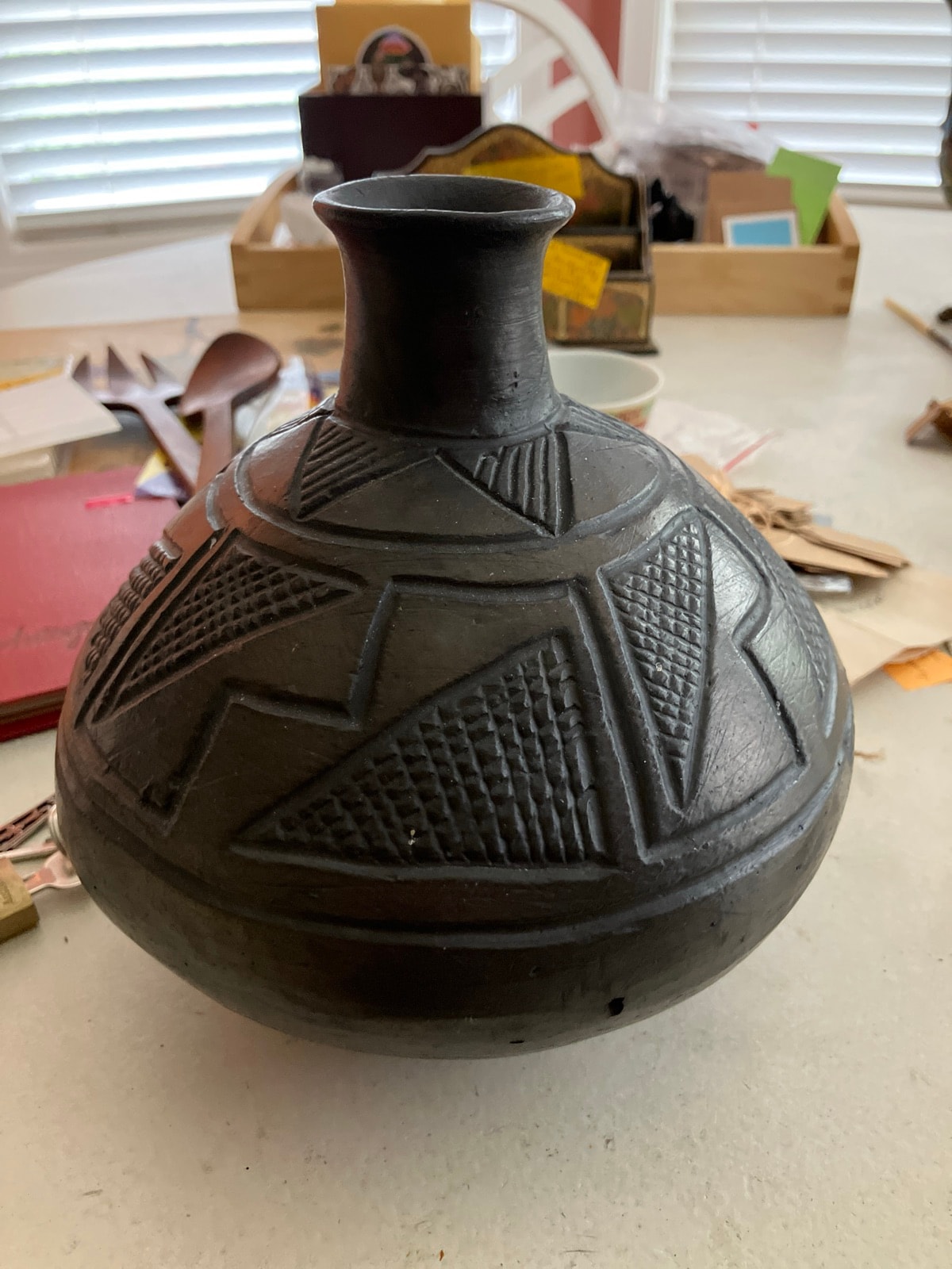 This striking blackware vessel features a hand-burnished matte finish with deeply incised geometric patterns, including triangles and cross-hatched textures. The form is a classic bulbous vase with a flared rim, characteristic of traditional African earthenware techniques adapted for contemporary studio art.