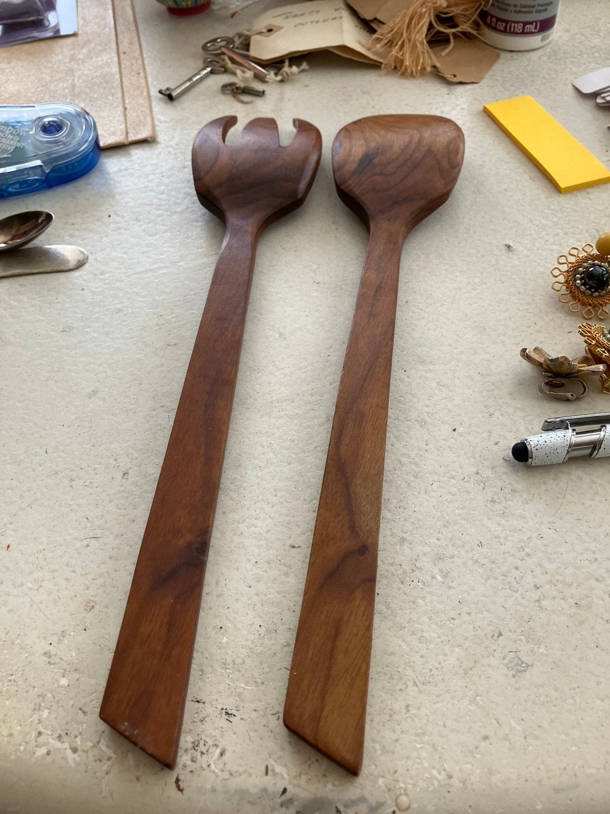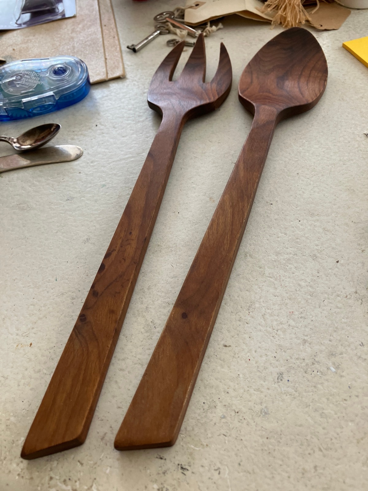 The wood appears well-preserved with a healthy luster, suggesting they have been oiled recently. There is no visible cracking or 'fuzzing' of the grain from dishwasher damage, which significantly preserves their value. Regular treatment with food-grade mineral oil will keep them in top condition.