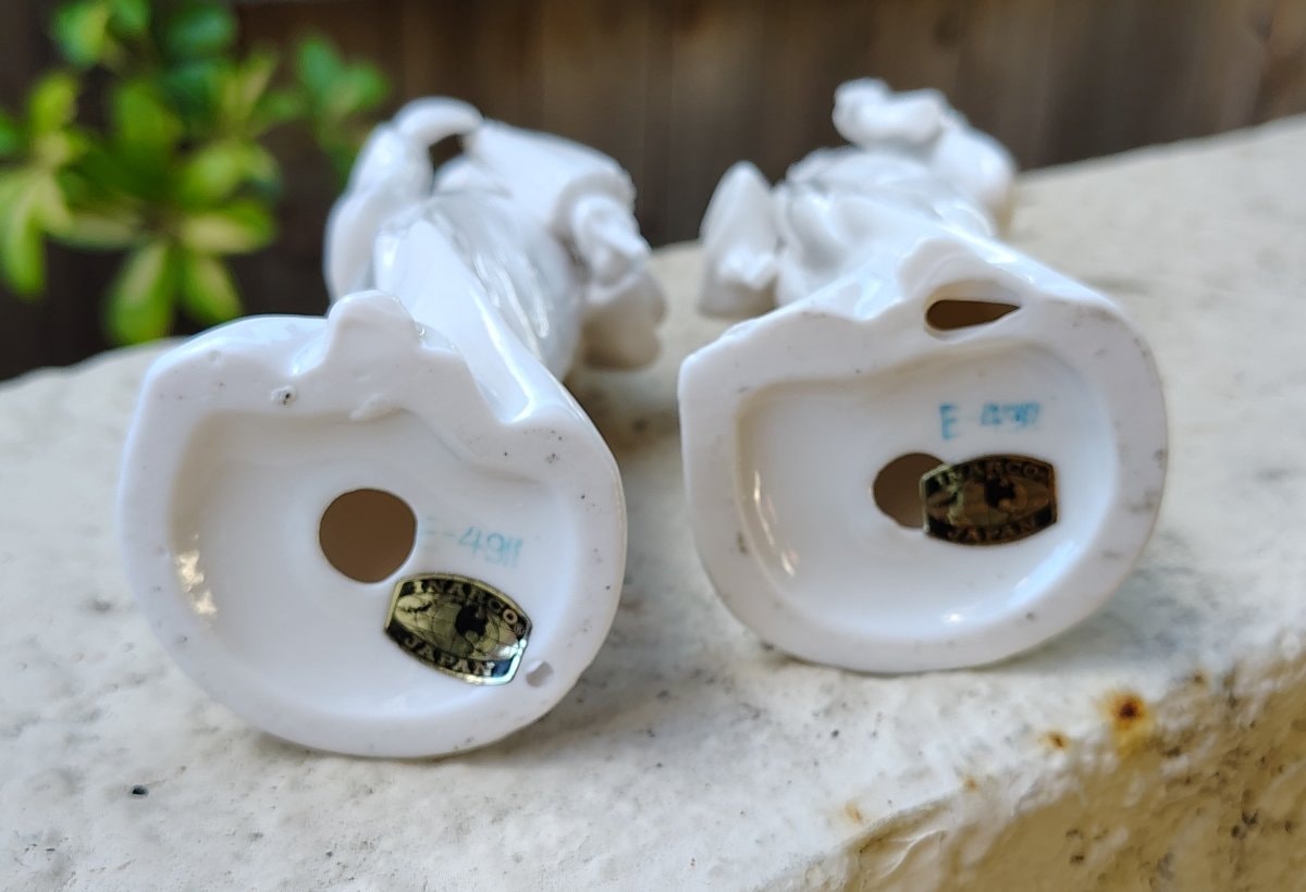 The figurines appear to be in excellent vintage condition with no visible chips, cracks, or crazing. The presence of the original gold foil 'Inarco Japan' stickers and the 'E-4911' stamps adds to their collectibility. Pristine condition is vital for monochrome pieces, as any damage is immediately visible against the white surface.