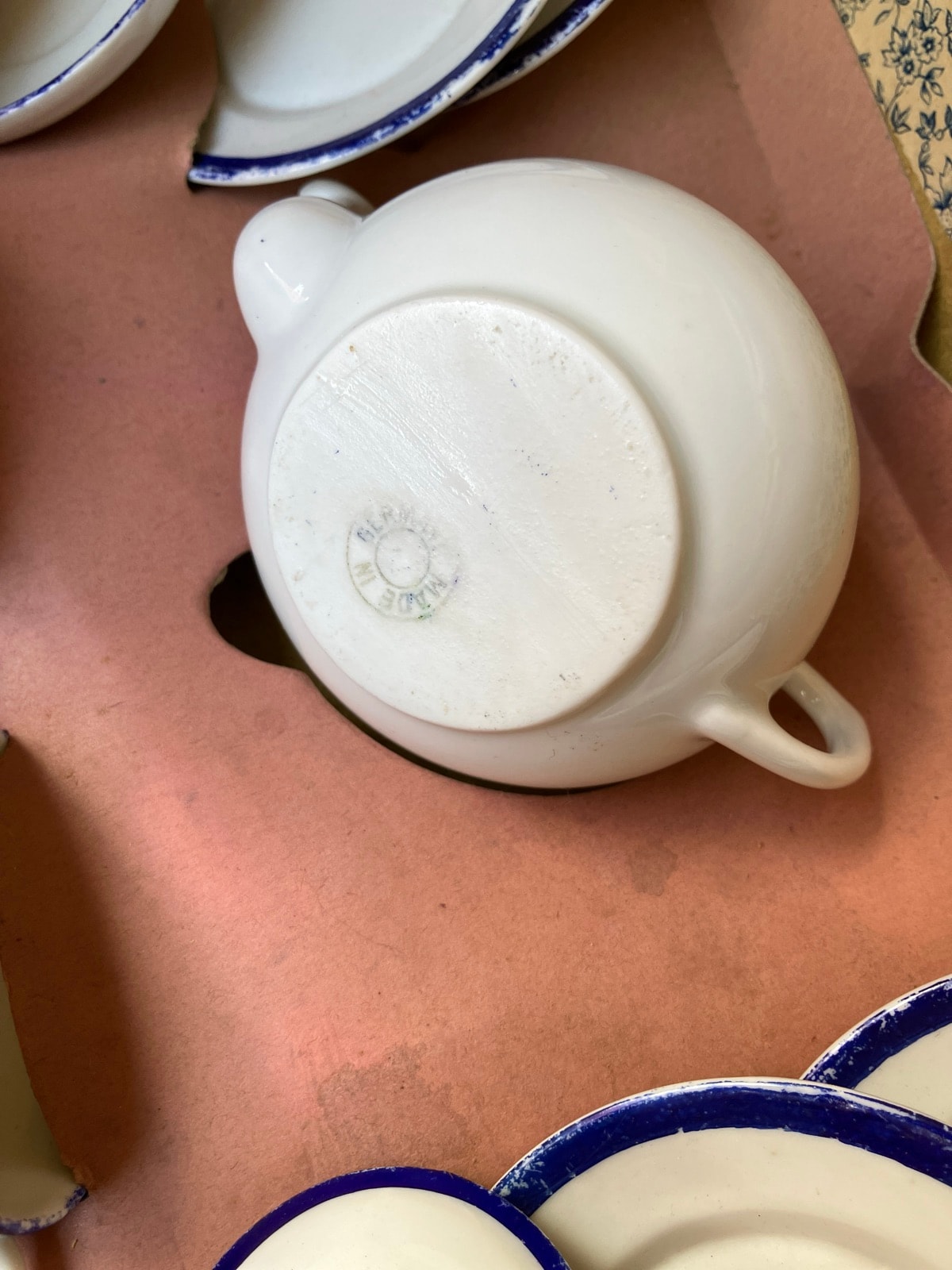 A charming miniature porcelain tea service featuring a bold cobalt blue border and delicate gilt floral accents. This set was designed as a 'toy' but crafted with the same high-fired porcelain and decorative…