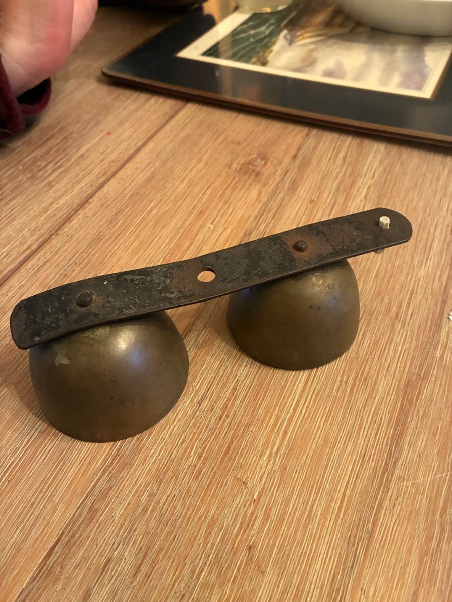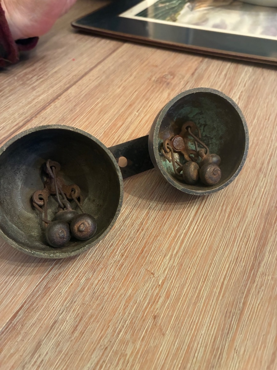 The brass shows a lovely deep patina with expected oxidation (verdigris) on the interior. The steel strap has surface rust but remains structurally sound. This honest wear confirms its history as a working piece of hardware. Value is driven by the fact that the original mounting strap and clappers are intact.