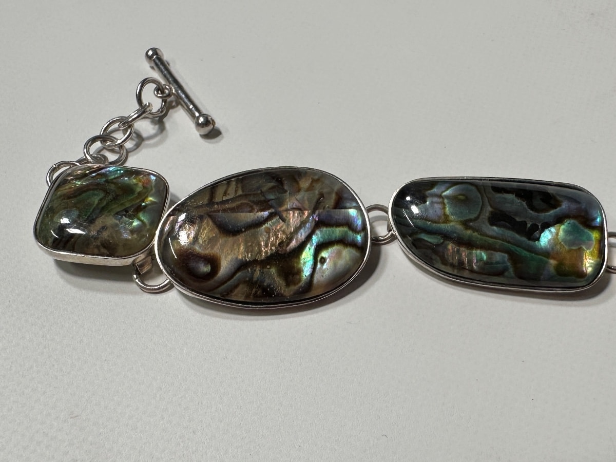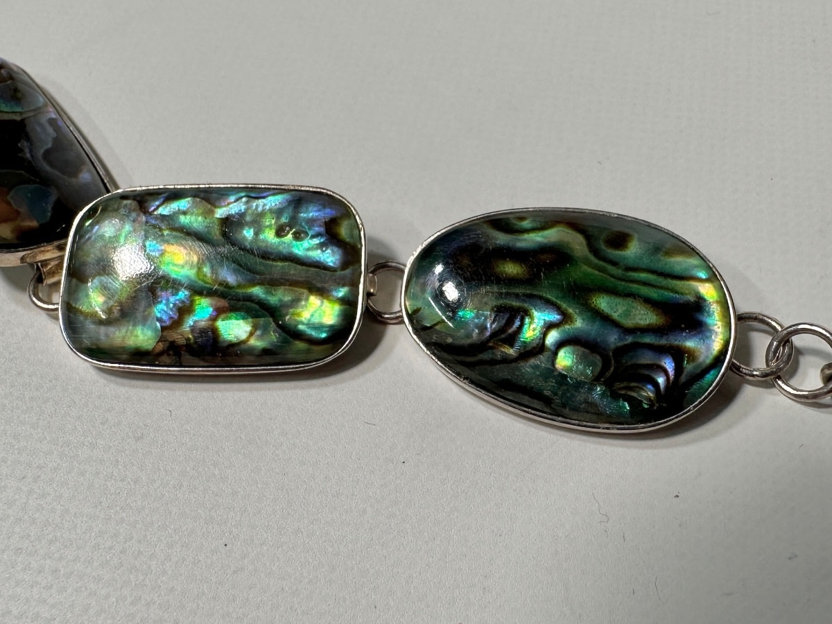The bracelet appears to be in excellent condition with a gentle patina on the silver, which highlights the 'LUC 925' hallmark. The abalone shells show a high luster with no visible cracks or delamination. Regular cleaning with a soft cloth will maintain the silver's brilliance without damaging the organic shell.